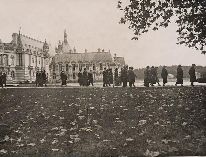 Gustave Macon et le groupe de la Conférence Internationale des Chemins de Fer devant le petit château, hiver 1922