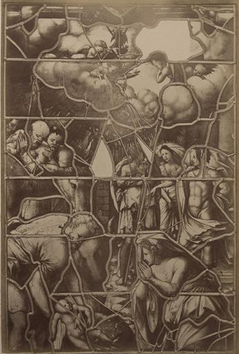POP | Plateforme ouverte du patrimoineVitrail de la chapelle de Chantilly (annexe nord), provenant de la sacristie de la chapelle d'Ecouen : Nativité (avant restauration)