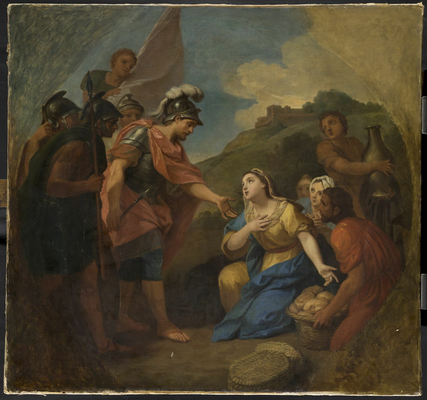 scène biblique (Abigaïl, don, corbeille, pain, récipient pour la boisson, David, soldat, à l'antique)