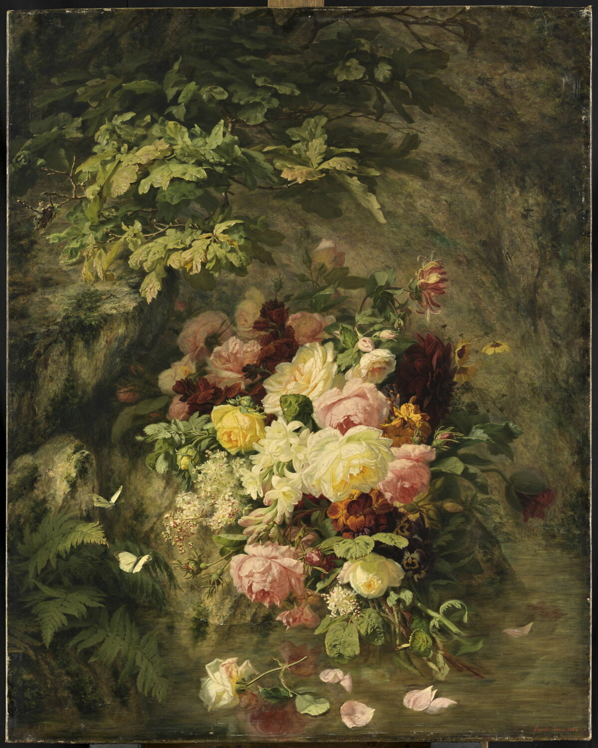 nature morte (bouquet, rose, chèvrefeuille, pavot, fougère, feuille, papillon, grotte)
