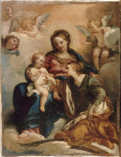 scène biblique (Vierge à l'Enfant, sainte Catherine d'Alexandrie, palme, roue, symbole, mariage, angelot)
