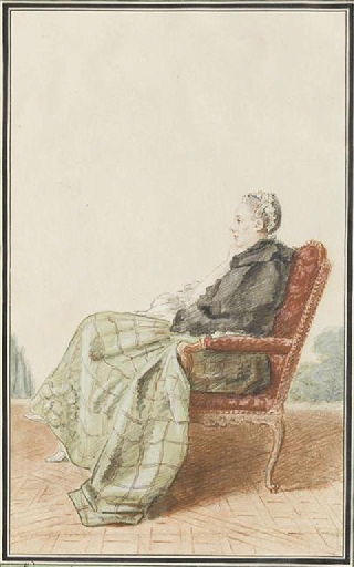 portrait (Savalette Geneviève, Gléon marquise de, femme, assis, de profil, terrasse, fauteuil)
