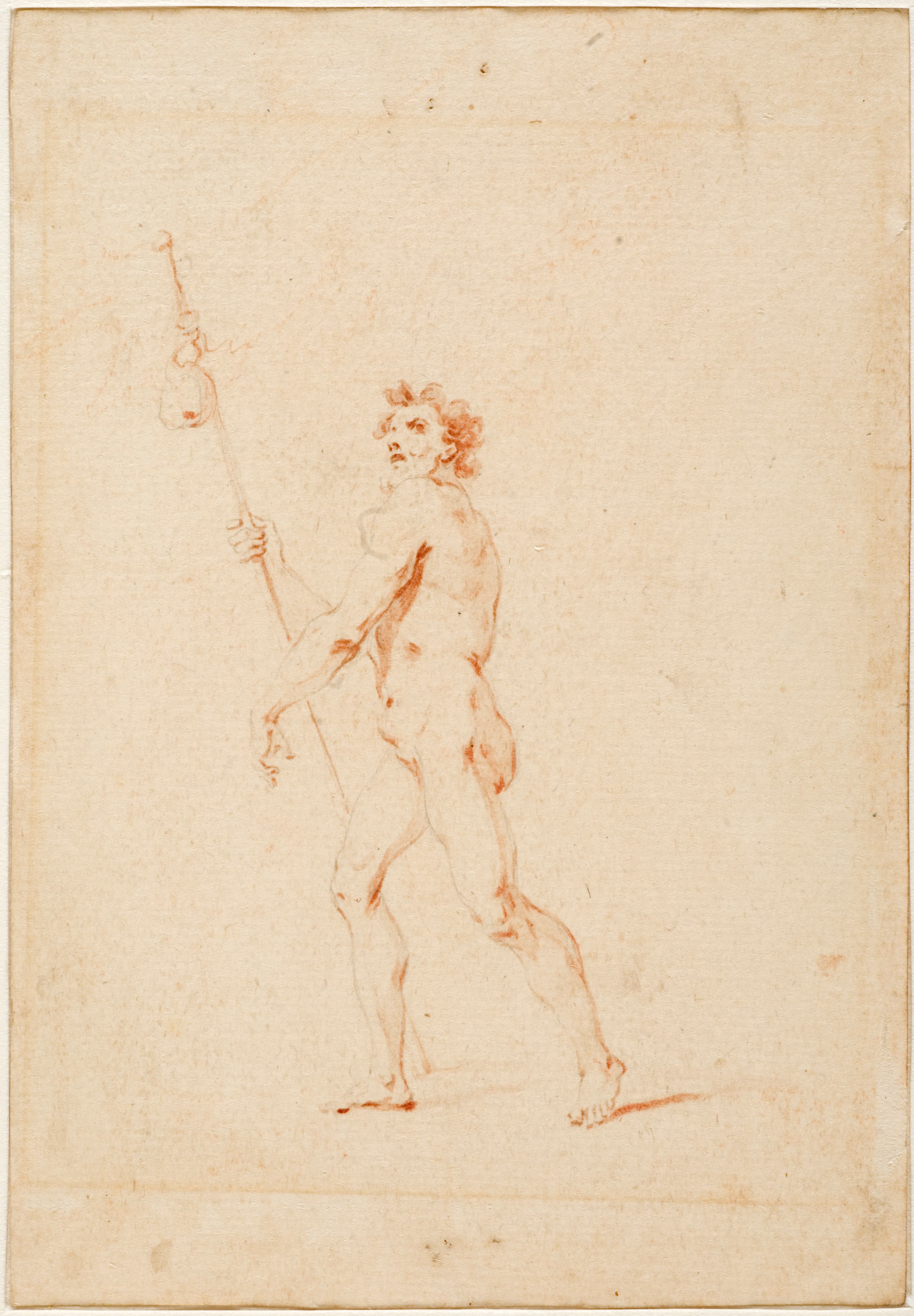 figure (homme, en pied, de profil, nu, bâton, récipient pour la boisson, ?)