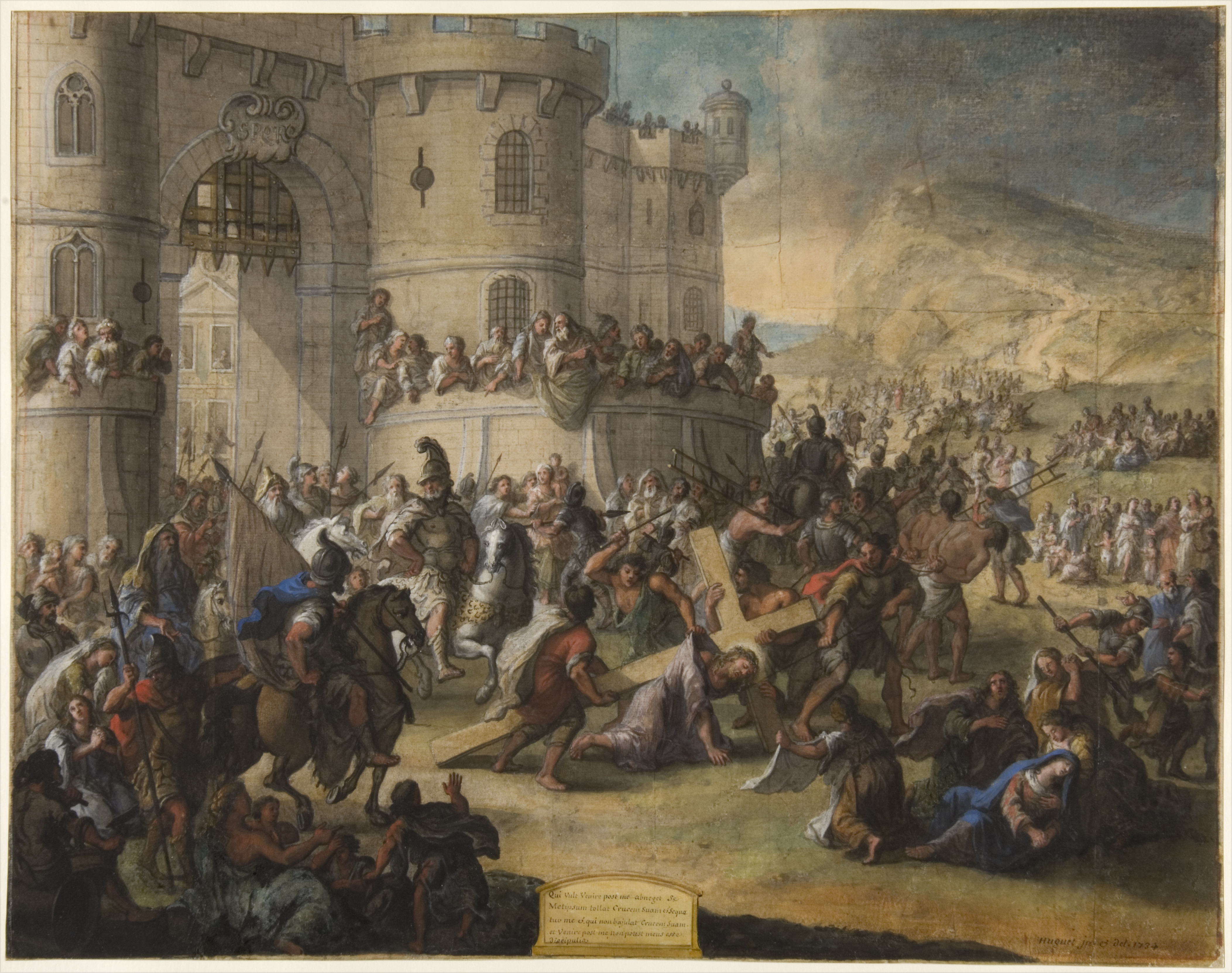 HUGUET IN. ET DEL. 1734 (S.D.B.D., A LA PLUME ET ENCRE NOIRE) ; QUI VULT VENIRE POST ME ABNEGET SE MET SSUM TOLLAT CRUCEUS SUAM ES SEQUA TUO ME ET QUI NON BAJULAT CRUCEM SUAM ET VENIRE POST ME NON POTEST MEUSESSE DIECIPUTIA (B.M. DANS LE CARTOUCHE, A LA PLUME ET ENCRE NOIRE)