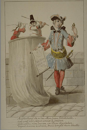AU PLUS HAUT DE CE SAC MON BEAU POLICHINELLE PAR CENT JOLIS PROPOS AMUSE LE PASSAN JE LUI PRONE MON BAUME EN RUSE CHARLATAN LEQUEL BAUME N'EST RIEN MAIS REMPLIT MON ECUELLE (B. SOUS LE DESSIN, A LA PLUME ET ENCRE GRISE)