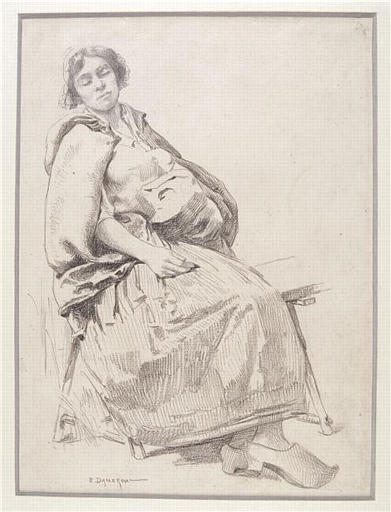 figure (femme, assis, de trois-quarts, paysan, sommeil, chaussure : bois, coiffe)