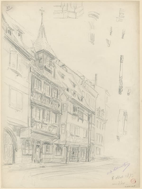 dessin à la plume et encre noire et lavis gris, de format plus réduit, agrémenté de personnages : projet d'illustration pour Seyboth Ad., Strasbourg historique et pittoresque, Imprimerie Alsacienne, Strasbourg, 1894, p.605 au cabinet des estampes et des dessins de Strasbourg (77.985.0.43) ; numéros d'inventaire des autres éléments : 77.985.0.36 ; 77.985.0.63 ; 77.985.0.84 ; 77.985.0.78