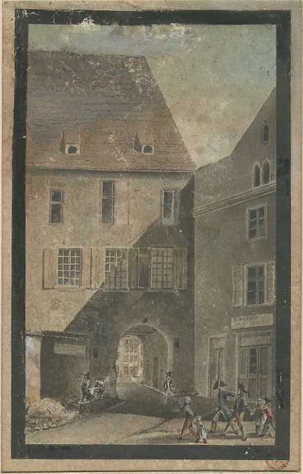 dessin identique de Volz à la mine de plomb, sans personnages, au cabinet des estampes et des dessins de Strasbourg ; numéros d'inventaire des autres éléments : 77.985.0.11