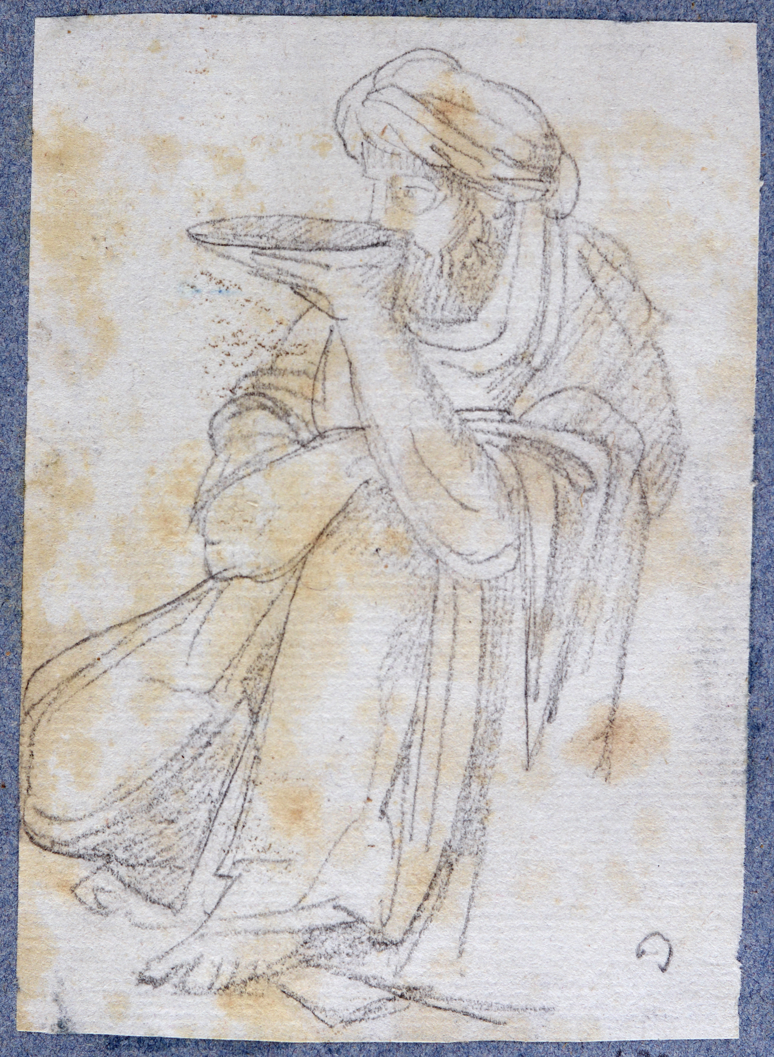 figure (homme, assis, de trois-quarts, assiette, couvre-chef : à l'orientale)