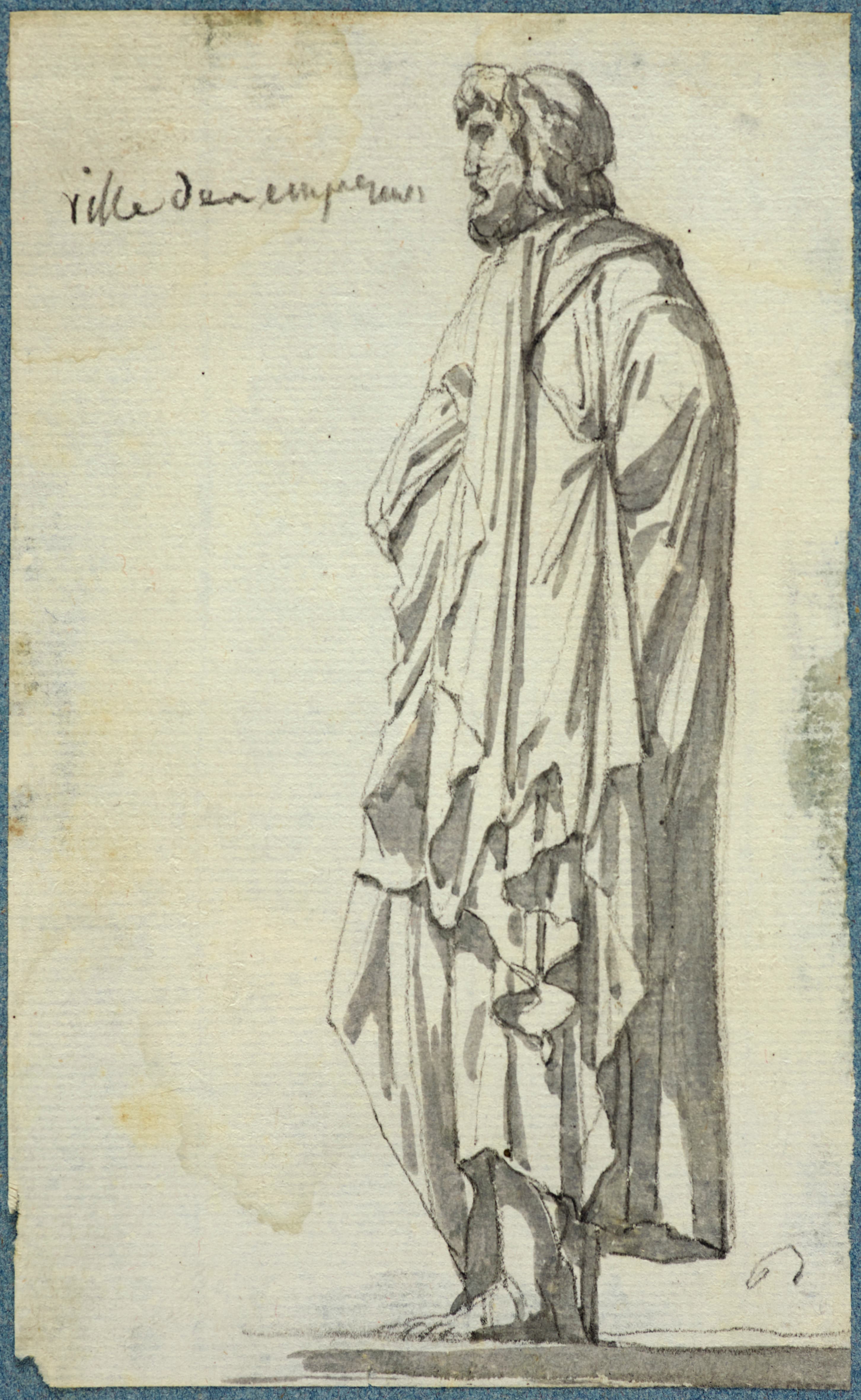 représentation d'objet (ronde bosse) ; ronde bosse (homme, en pied, de profil, manteau : Romain, antiquité)