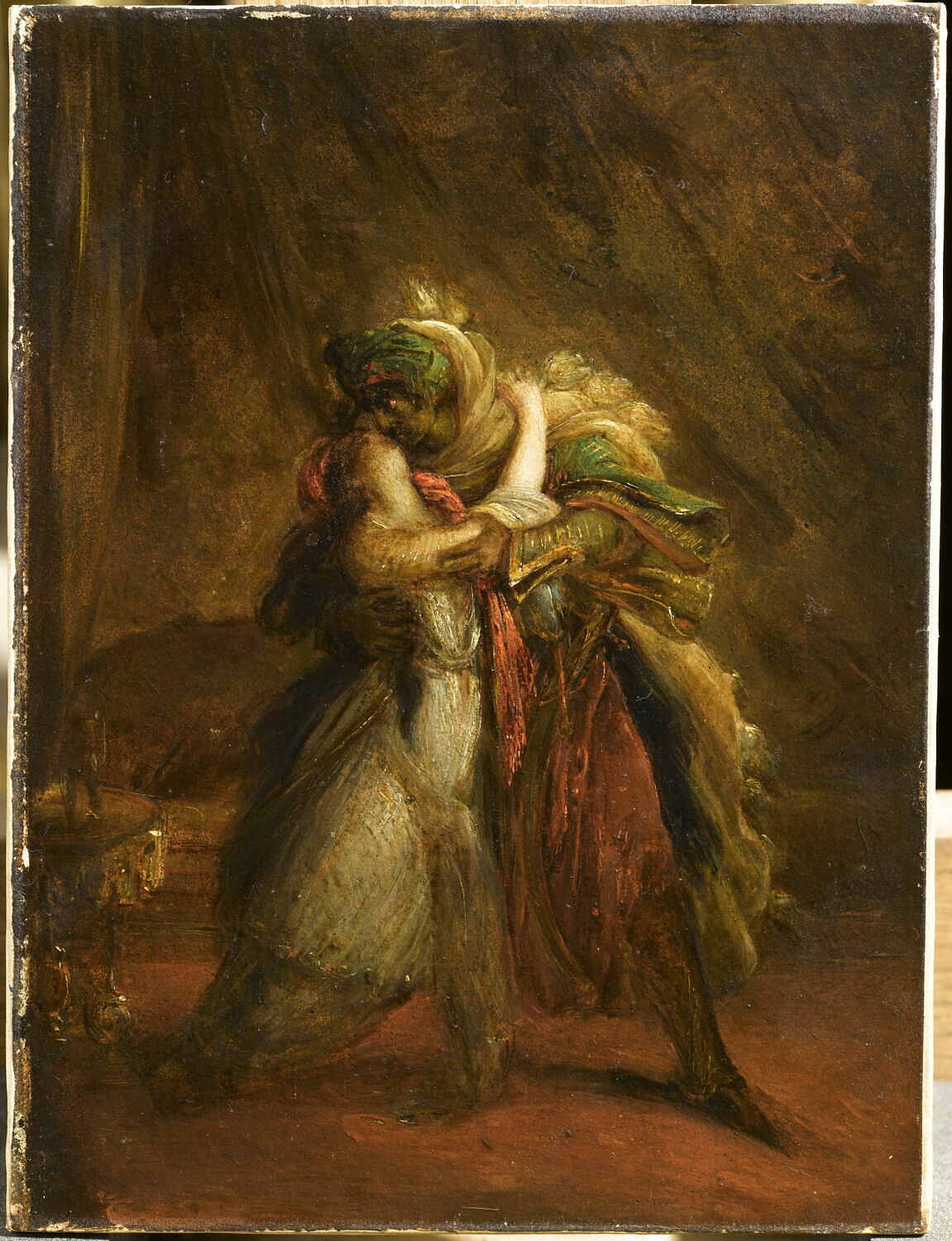 scène (Othello, Noir, Desdémone, étreinte, baiser : bouche, vêtement : à l'orientale)