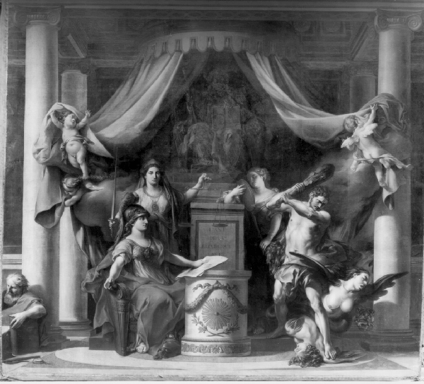 Minerve remet à Hercule le décret qui a aboli les vices de l'ancien gouvernement