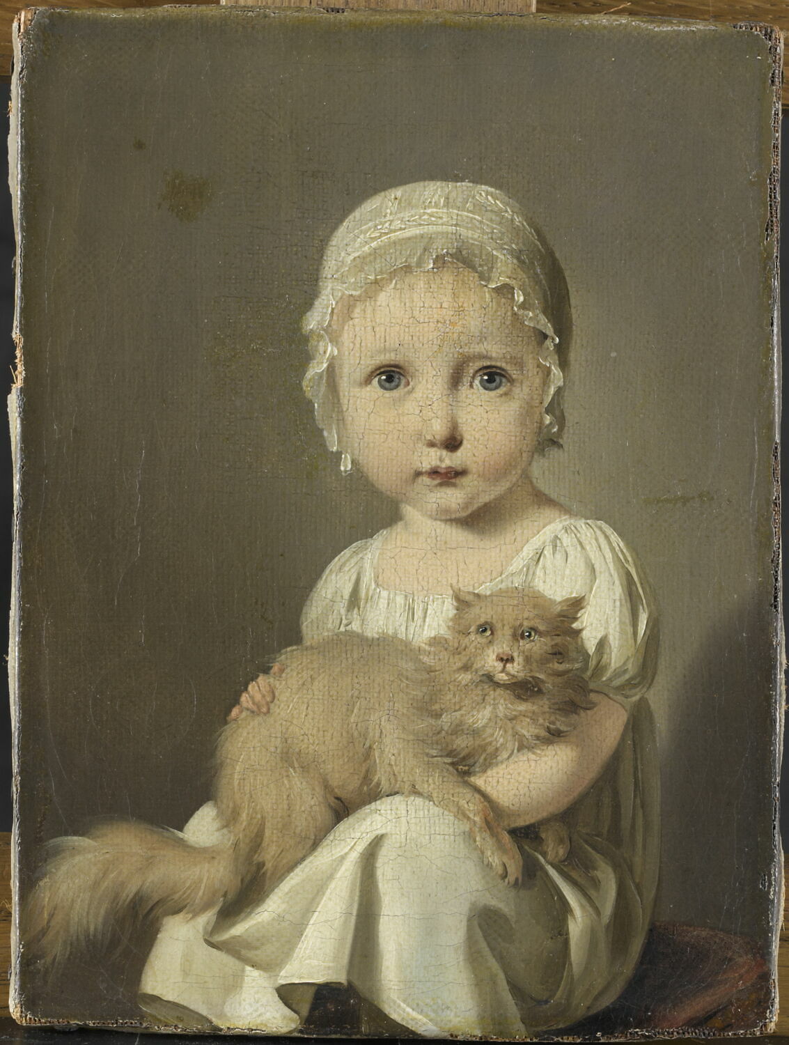portrait (Arnault Gabrielle, fillette, à mi-corps, de face, coiffe, chat)