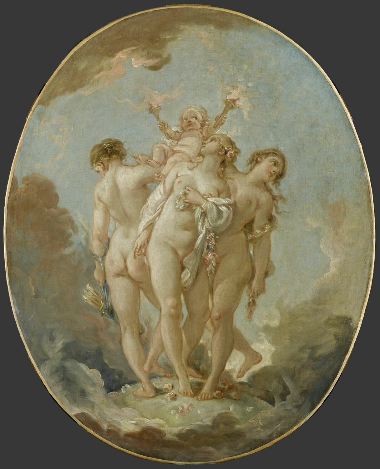 figures mythologiques (les Grâces, femme, nudité, de dos, torche, carquois, rose, nourrisson)