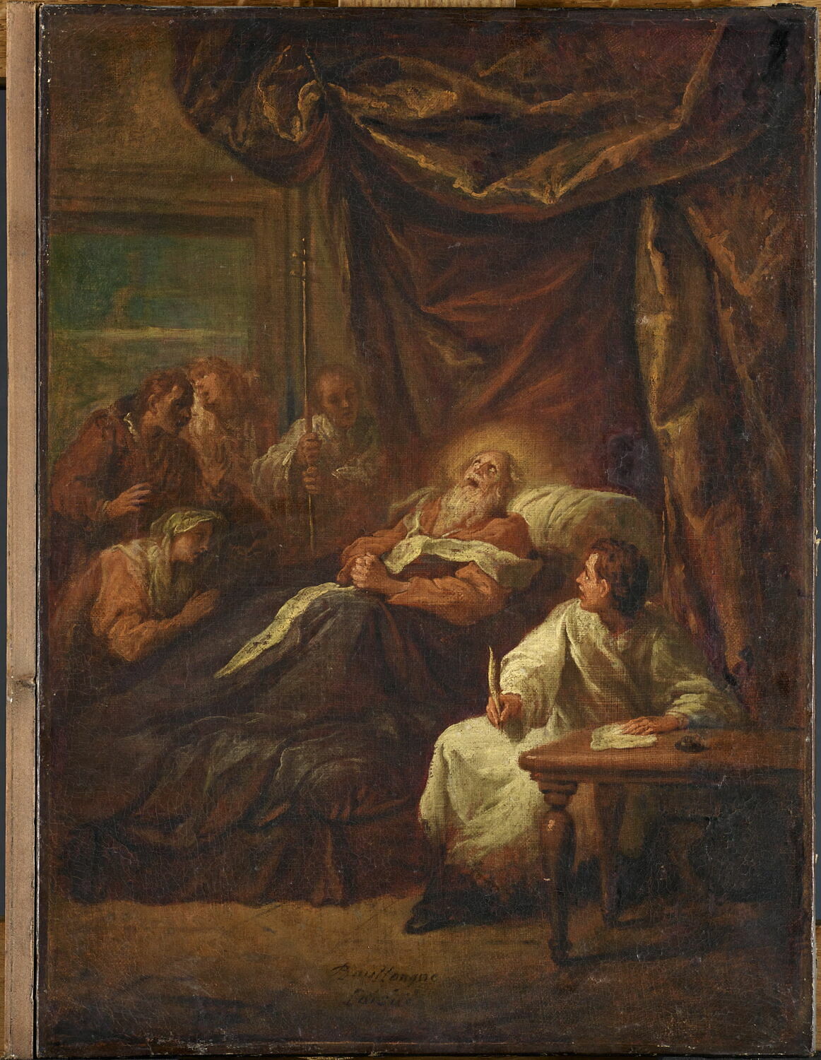 scène (saint Ambroise de Milan, agonie, homme, écriture, instrument d'écriture : plume, encrier, femme, tristesse, lit, table)