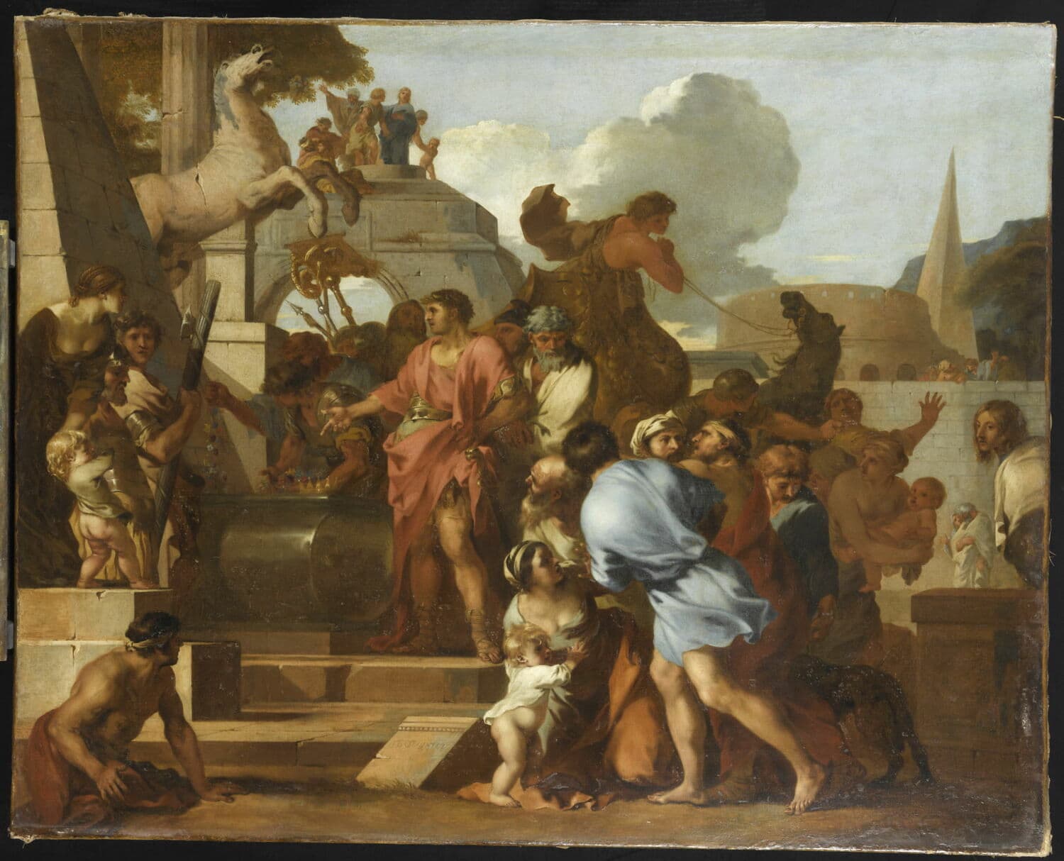 scène historique (Auguste, femme, enfant, chien, cheval, foule) ; vue d'architecture (tombeau : Alexandre le Grand, pyramide, sculpture : cheval)