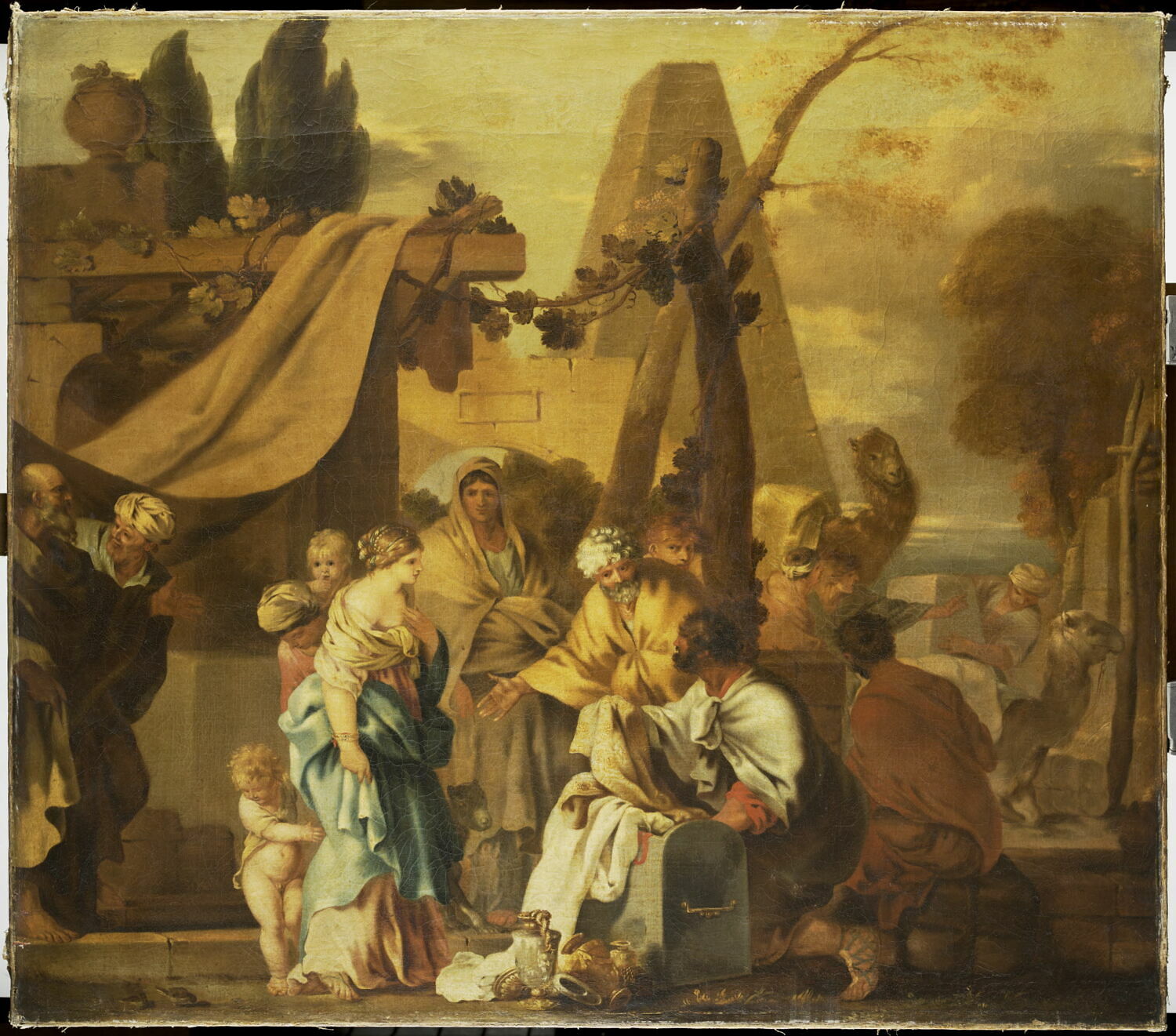 scène biblique (Laban, coffre, vase, chameau, pyramide, femme, enfant, homme)