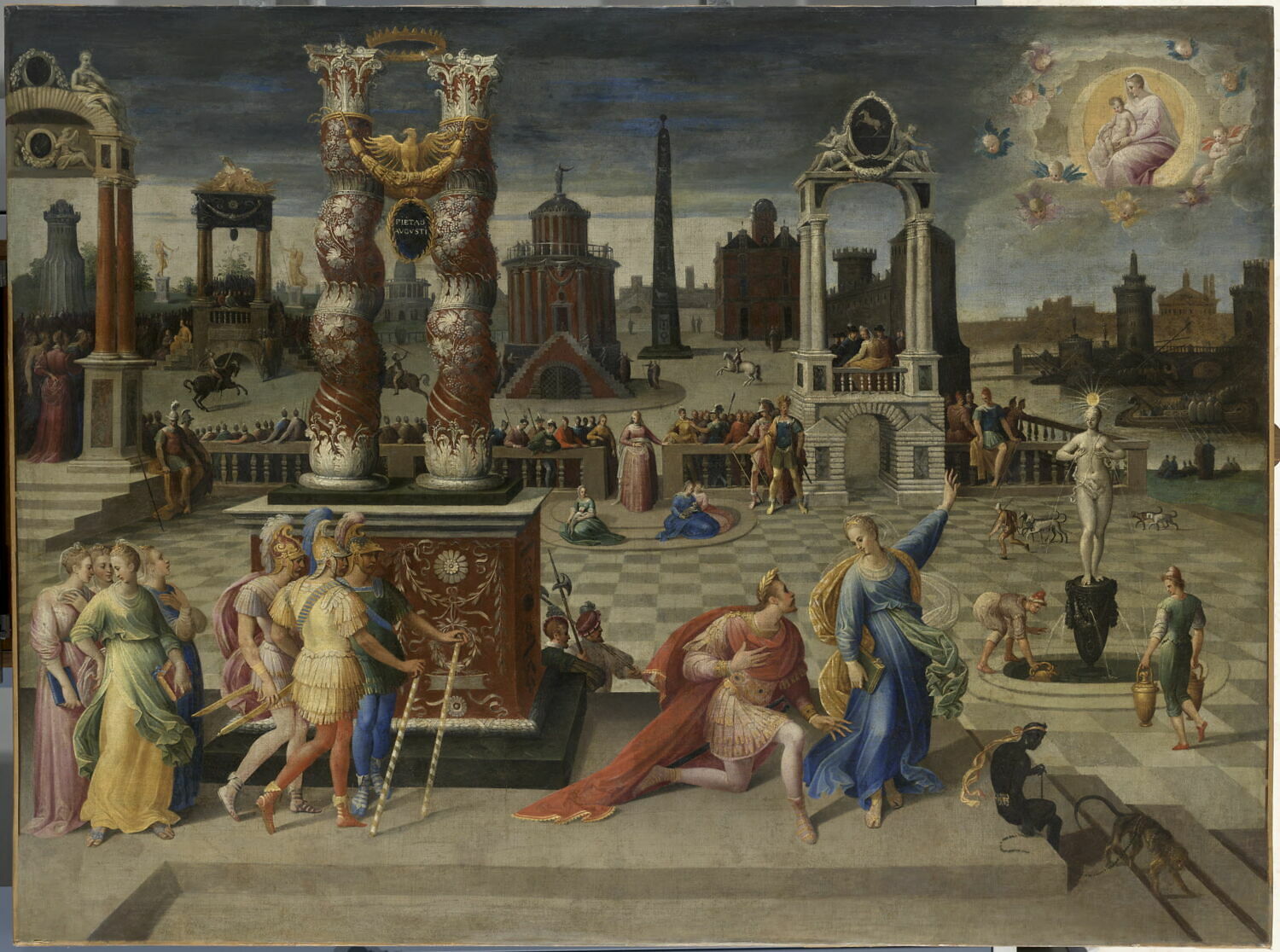 scène (Sibylle, information, soldat, promenade, femme, apparition, Vierge à l'Enfant, chien) ; cadre urbain (Tibur : de fantaisie, temple, obélisque monumental, arc monumental, cours d'eau, bateau à rames, fontaine)