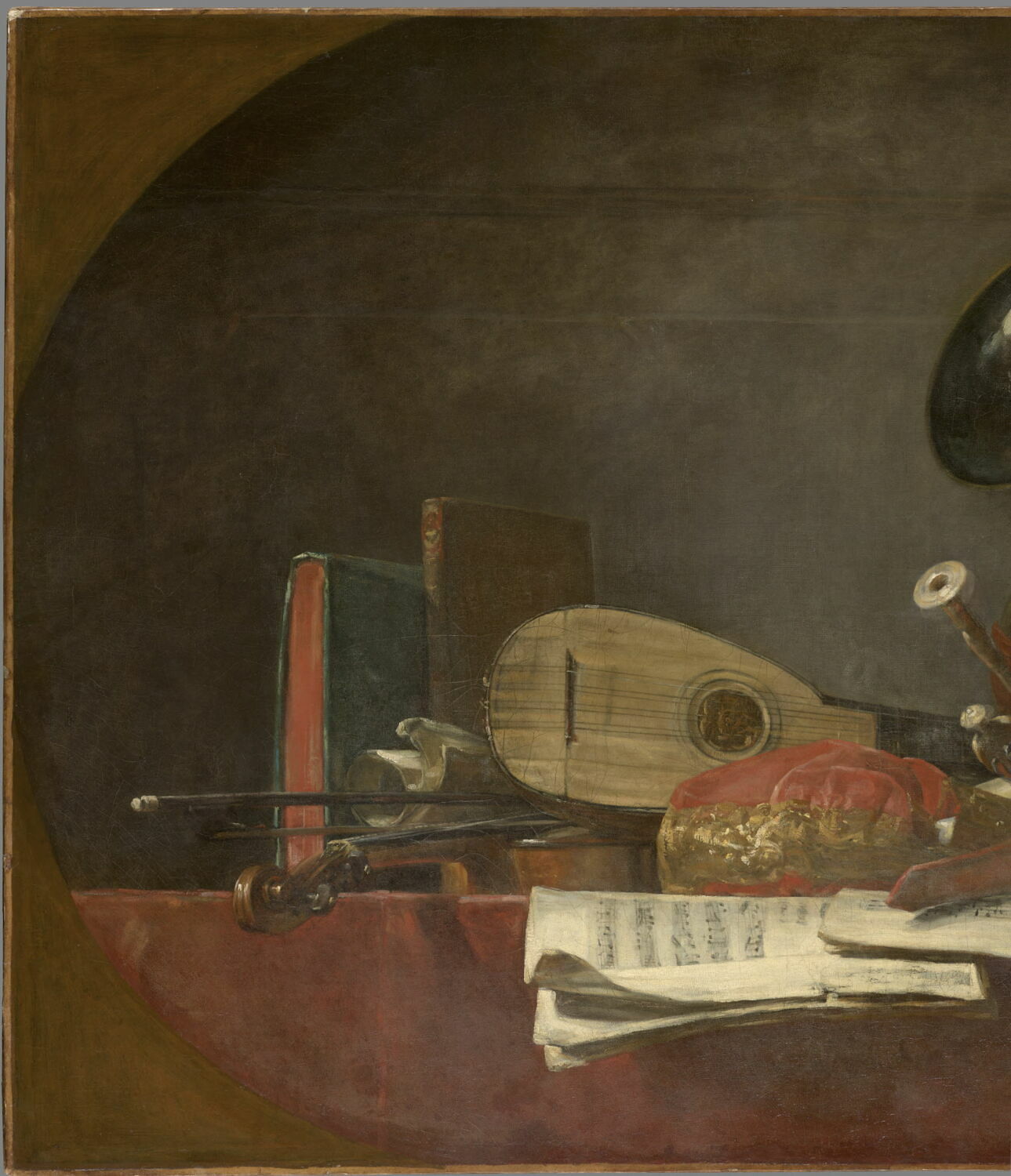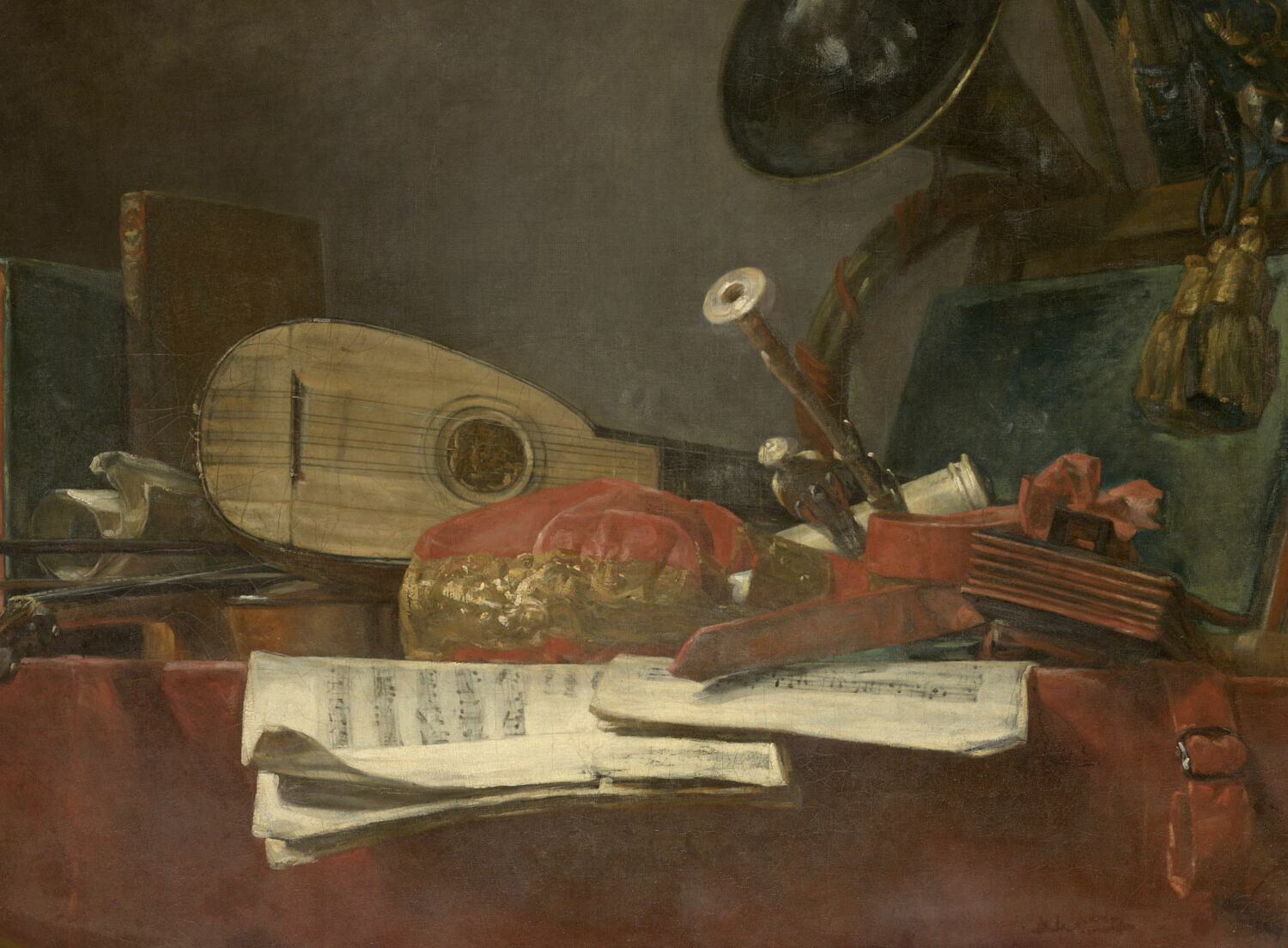 nature morte (luth, cor, chandelle, violon, livre, partition, instrument à biseau)