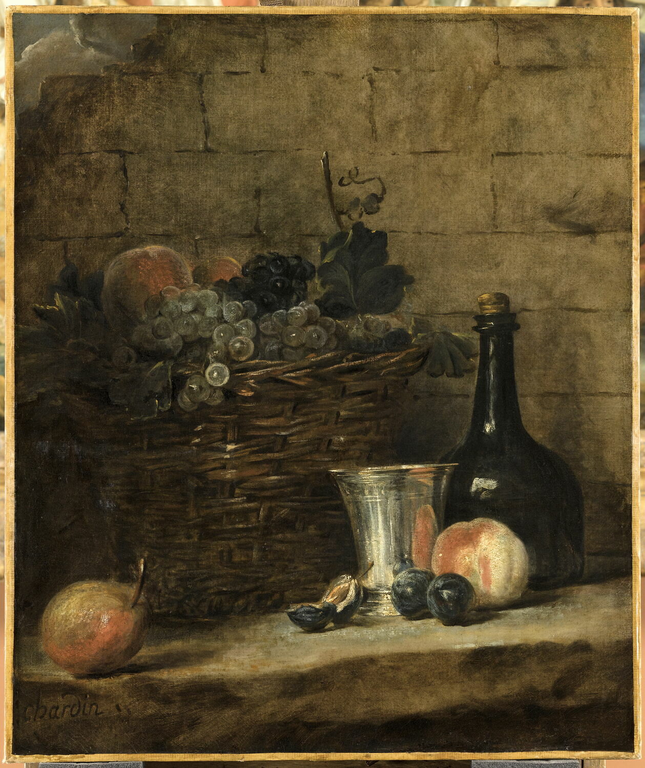 nature morte (panier : vannerie, raisin, pomme, prune, bouteille, gobelet : argent)