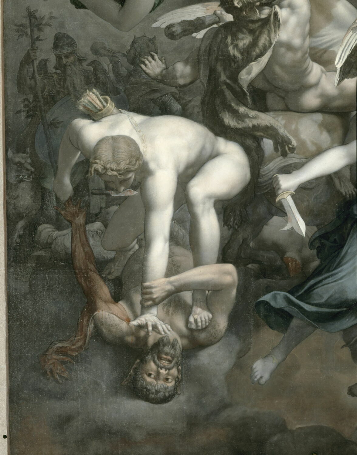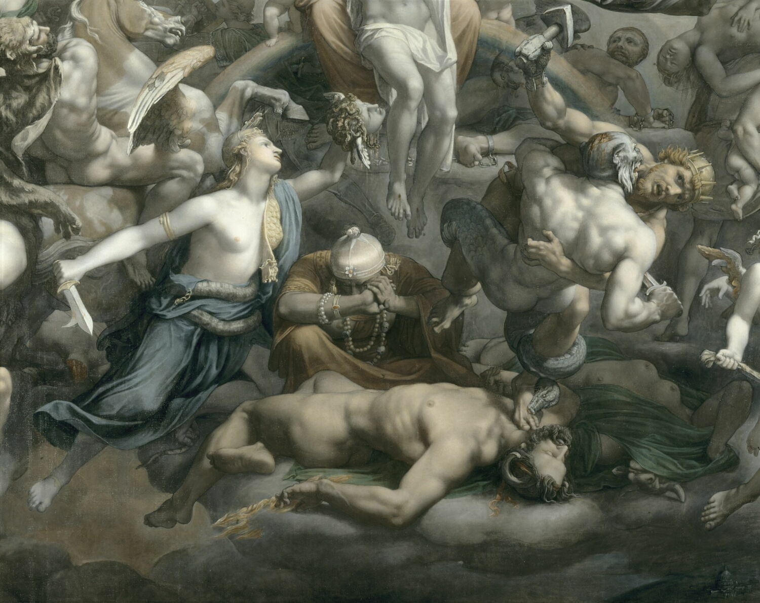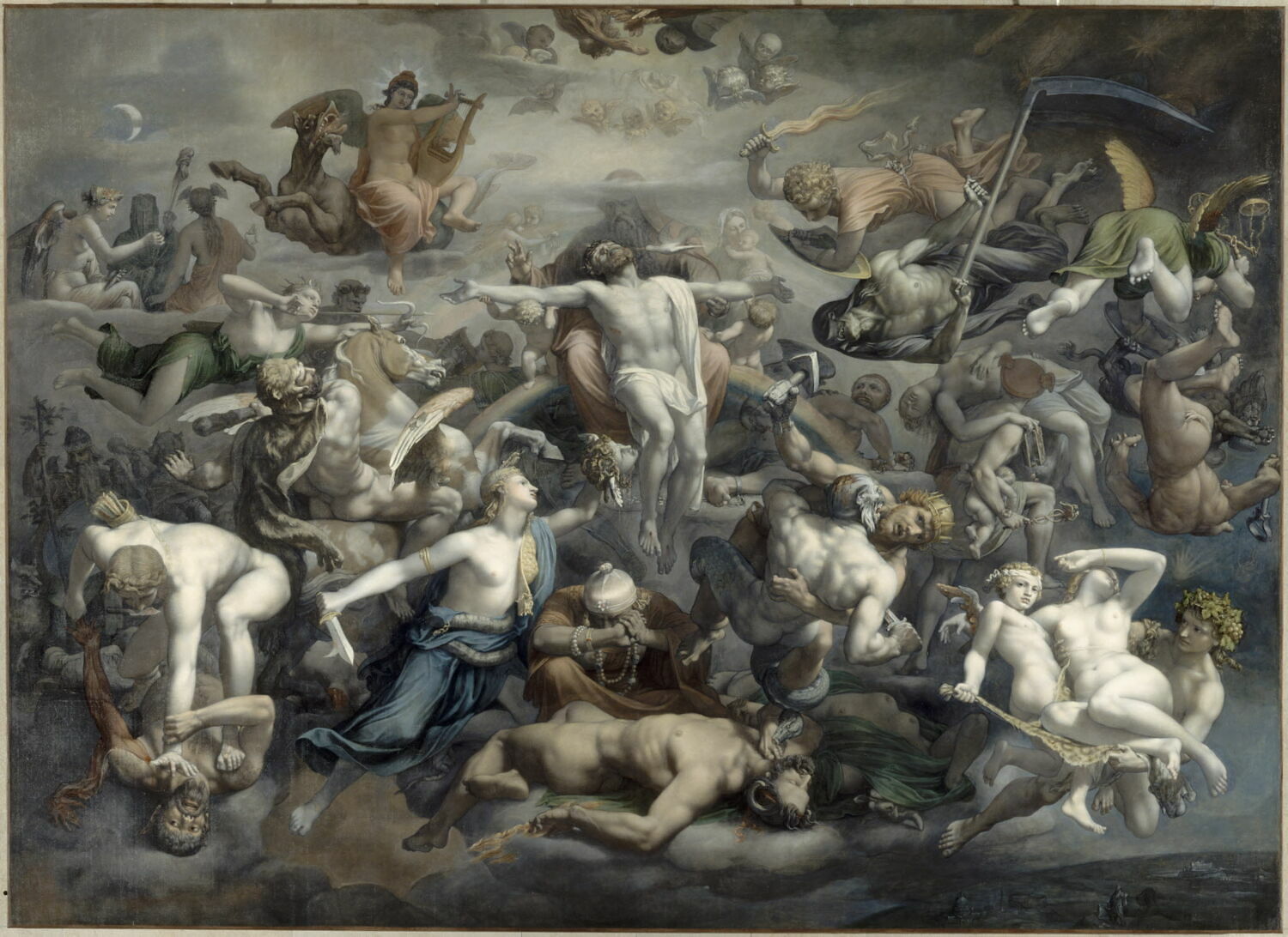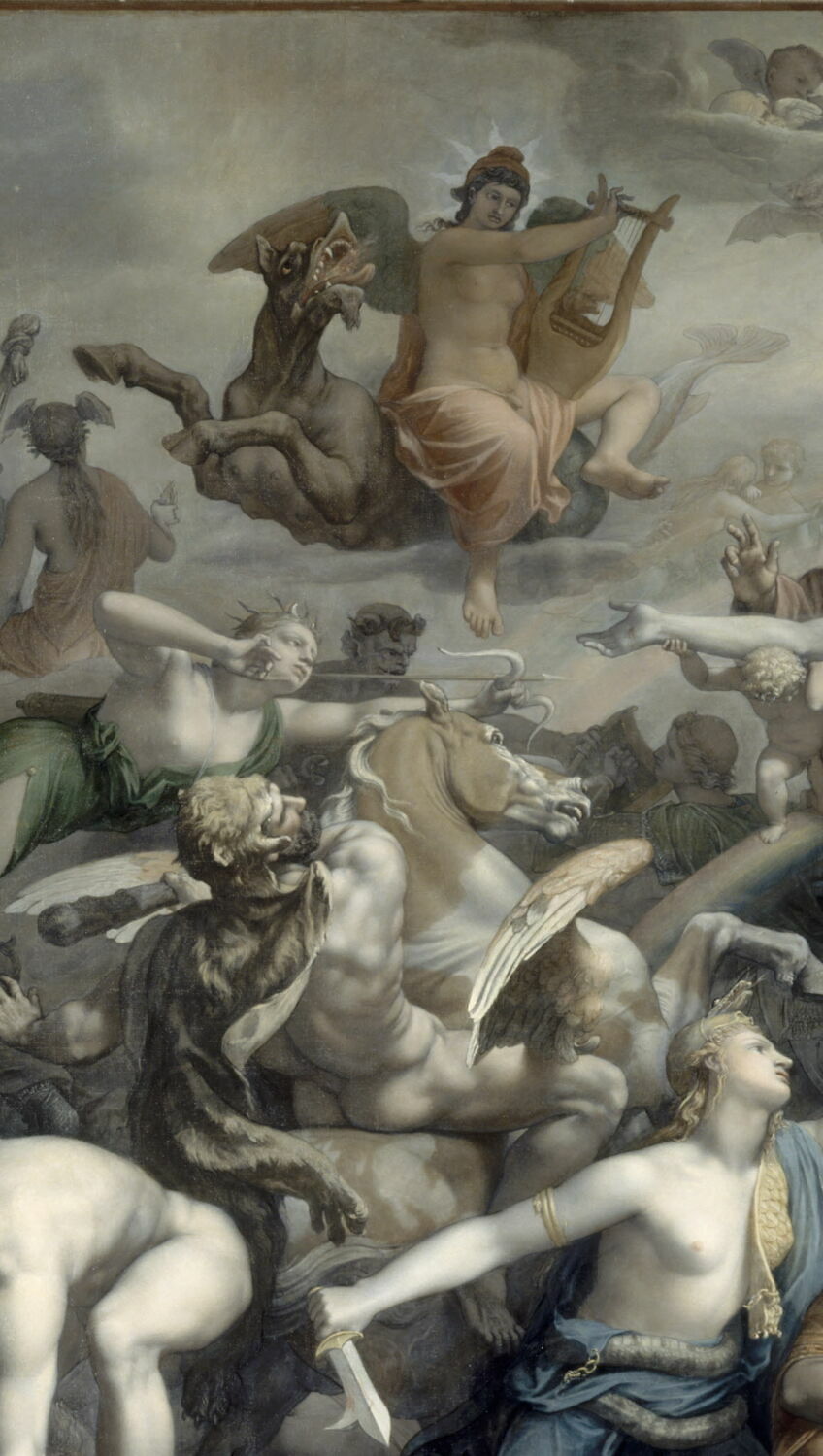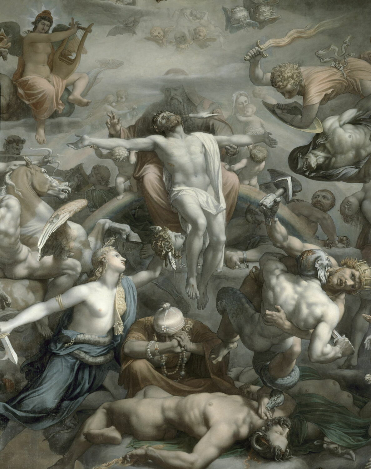 groupe de figures(Trinité,ange,saint Michel,lutte contre le mal,allégorie:justice,allégorie:le temps,musicien,lyre,nudité,divinité:paganisme,cheval)