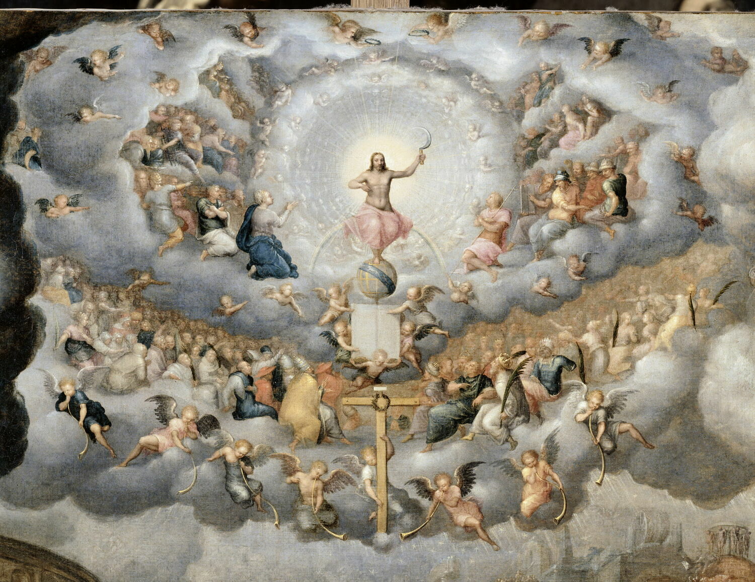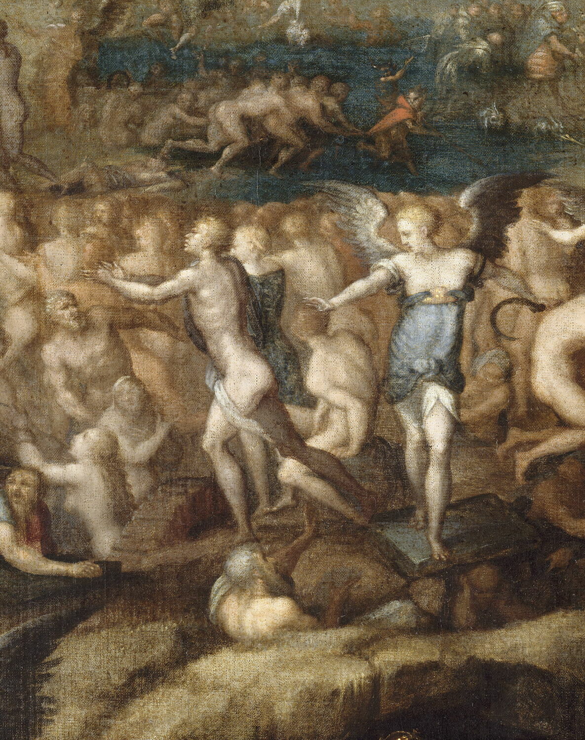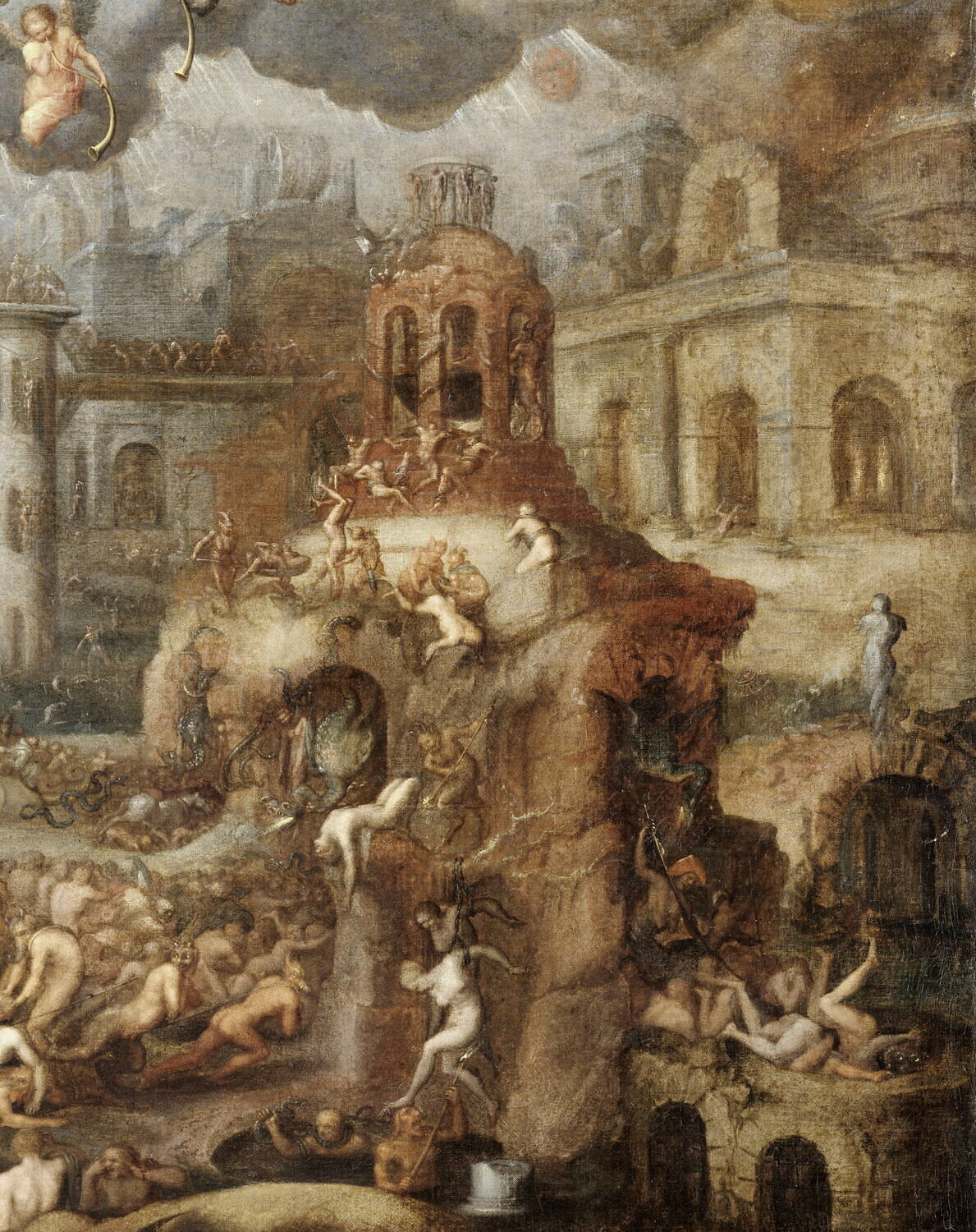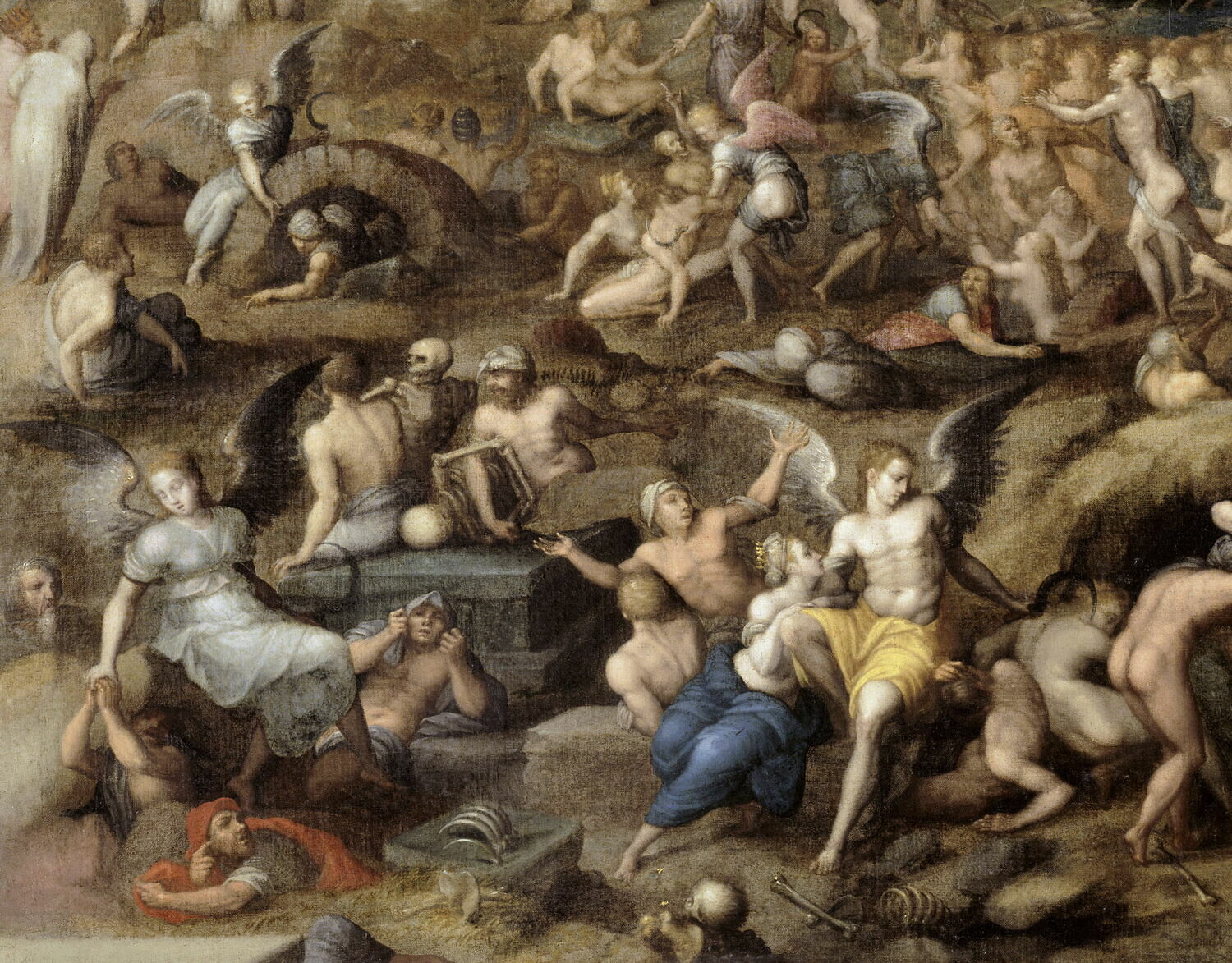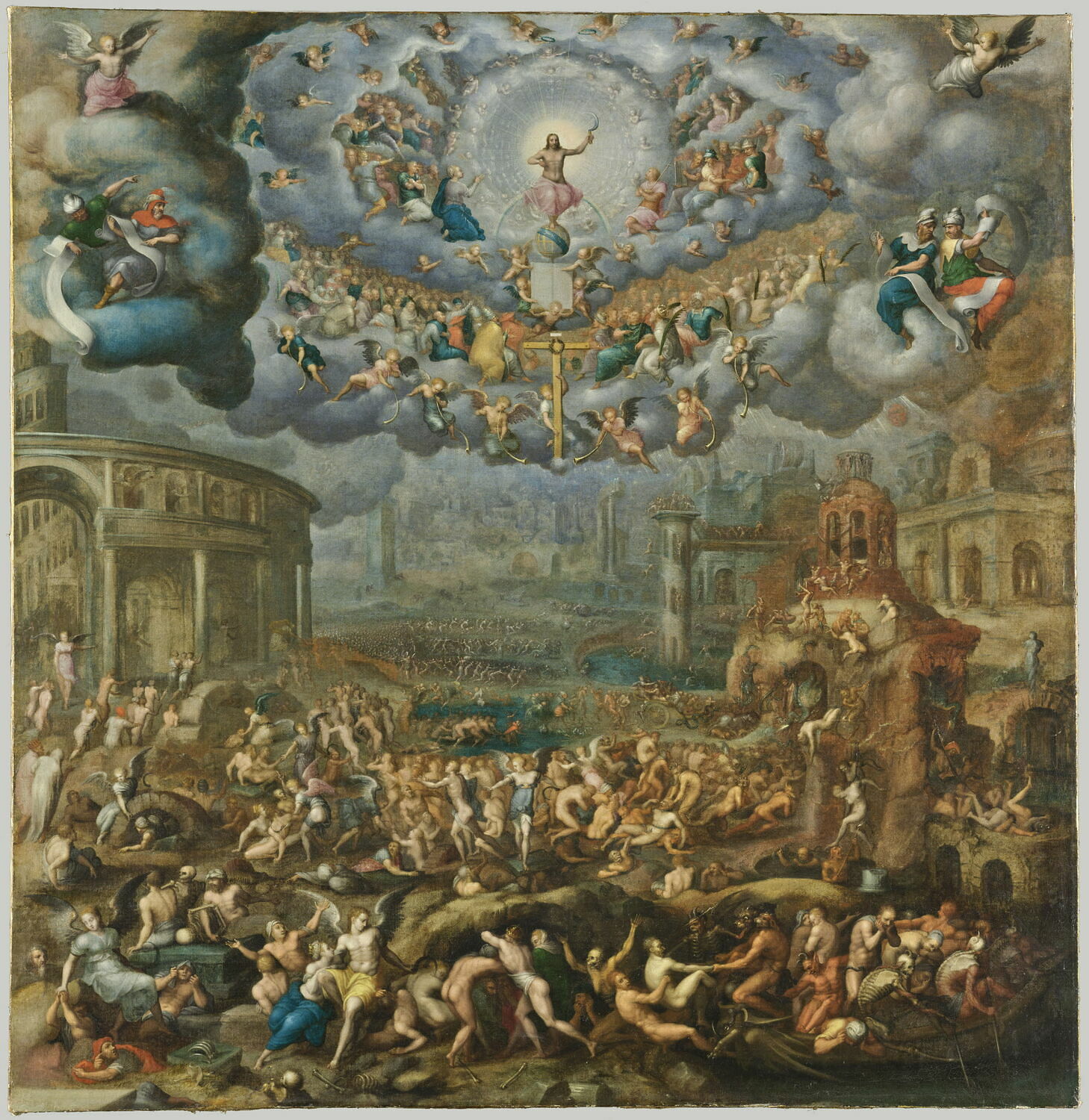 scène biblique (Jugement Dernier, foule, ville, ange, nuée)