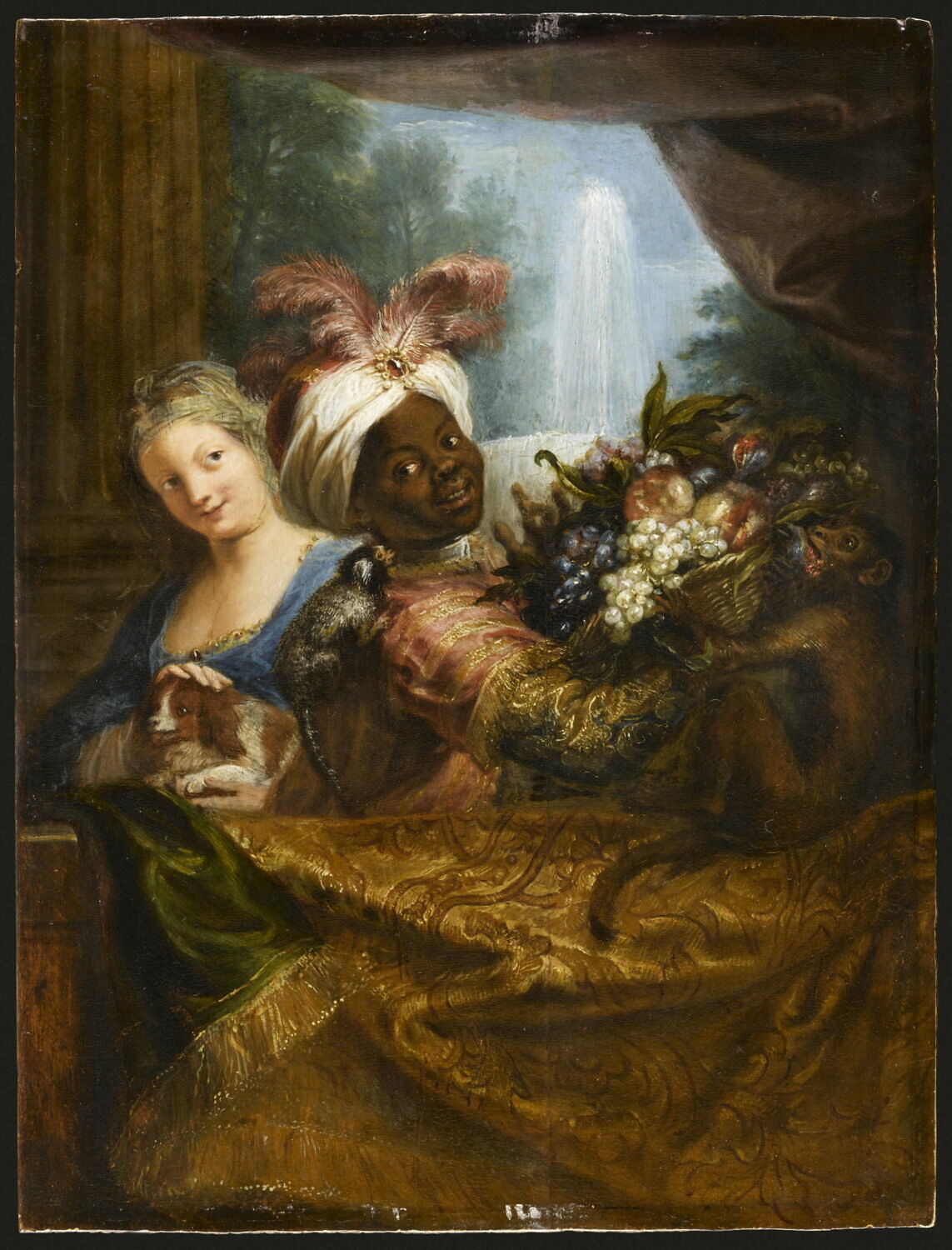 groupe de figures (jeune homme : Noir, raisin, pomme, habit : à l'orientale, couvre-chef, jeune fille, caresse, chien, draperie) ; fond de paysage