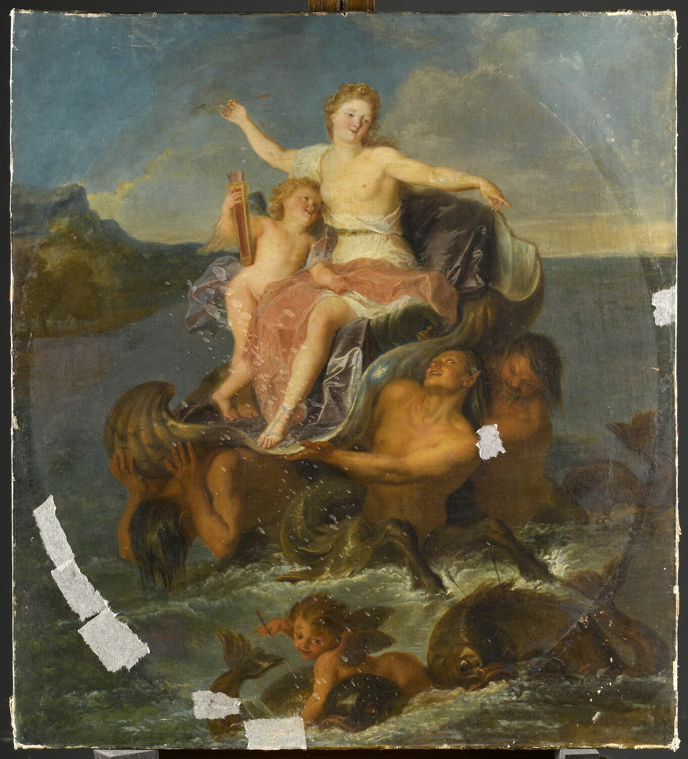 scène mythologique (Vénus, Cupidon, nudité, coquillage, bord de mer, Triton myth, centaure myth, putti)