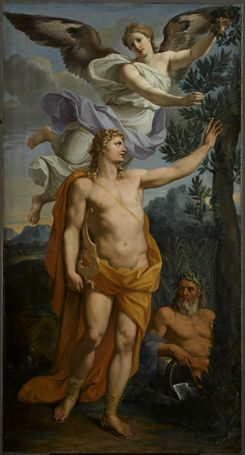 scène mythologique (Apollon : nudité, couronnement, allégorie : fleuve, allégorie : victoire, femme : aile, couronne : laurier)