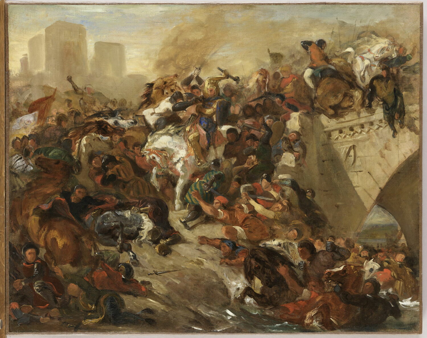 scène historique (bataille, Taillebourg, pont, cavalier, cadavre)
