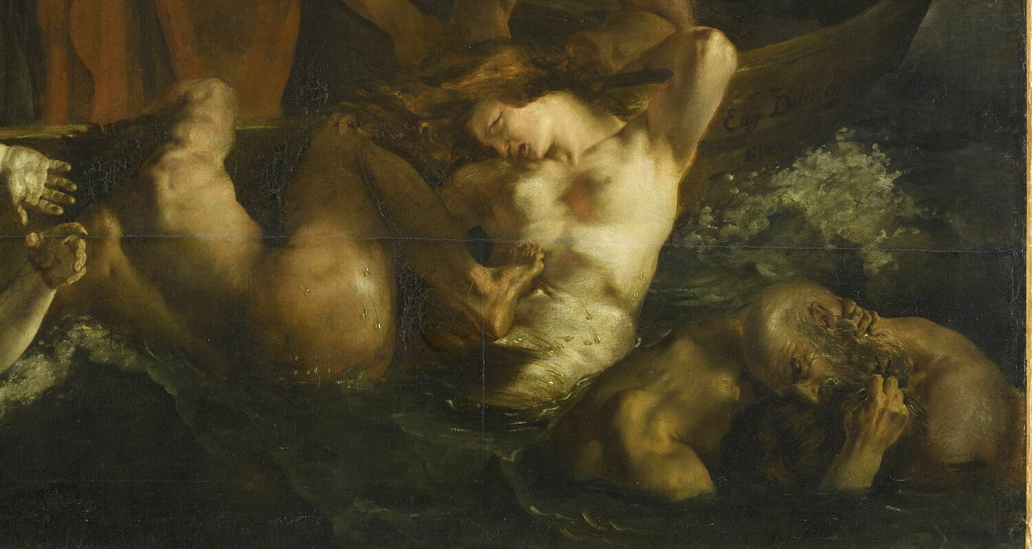 scène (Dante Alighieri, Virgile, barque, homme, nudité, noyade)