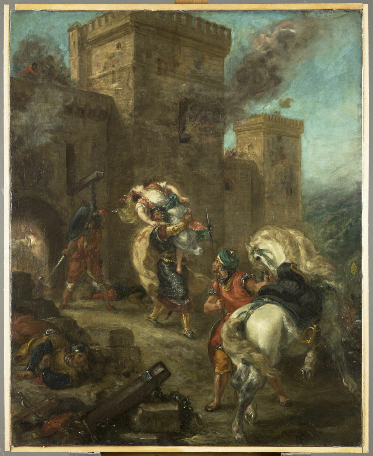 scène (Rébecca, enlèvement, soldat, cheval, fortification, incendie)