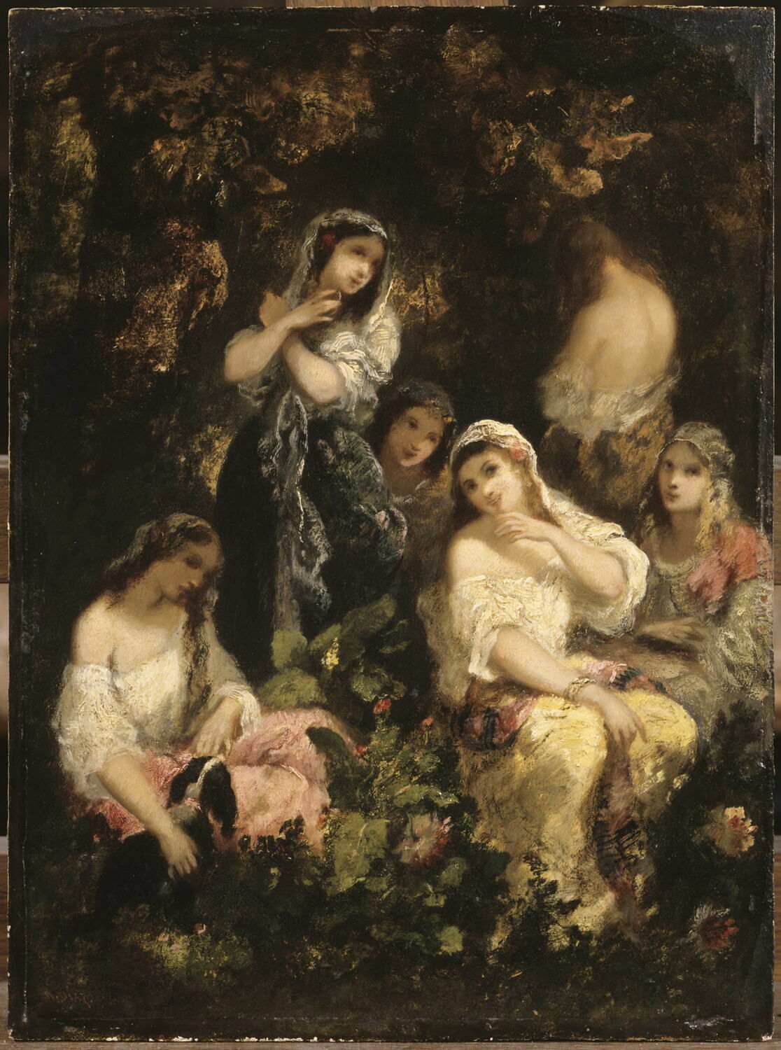 groupe de figures (jeune fille, conversation, repos) ; chien
