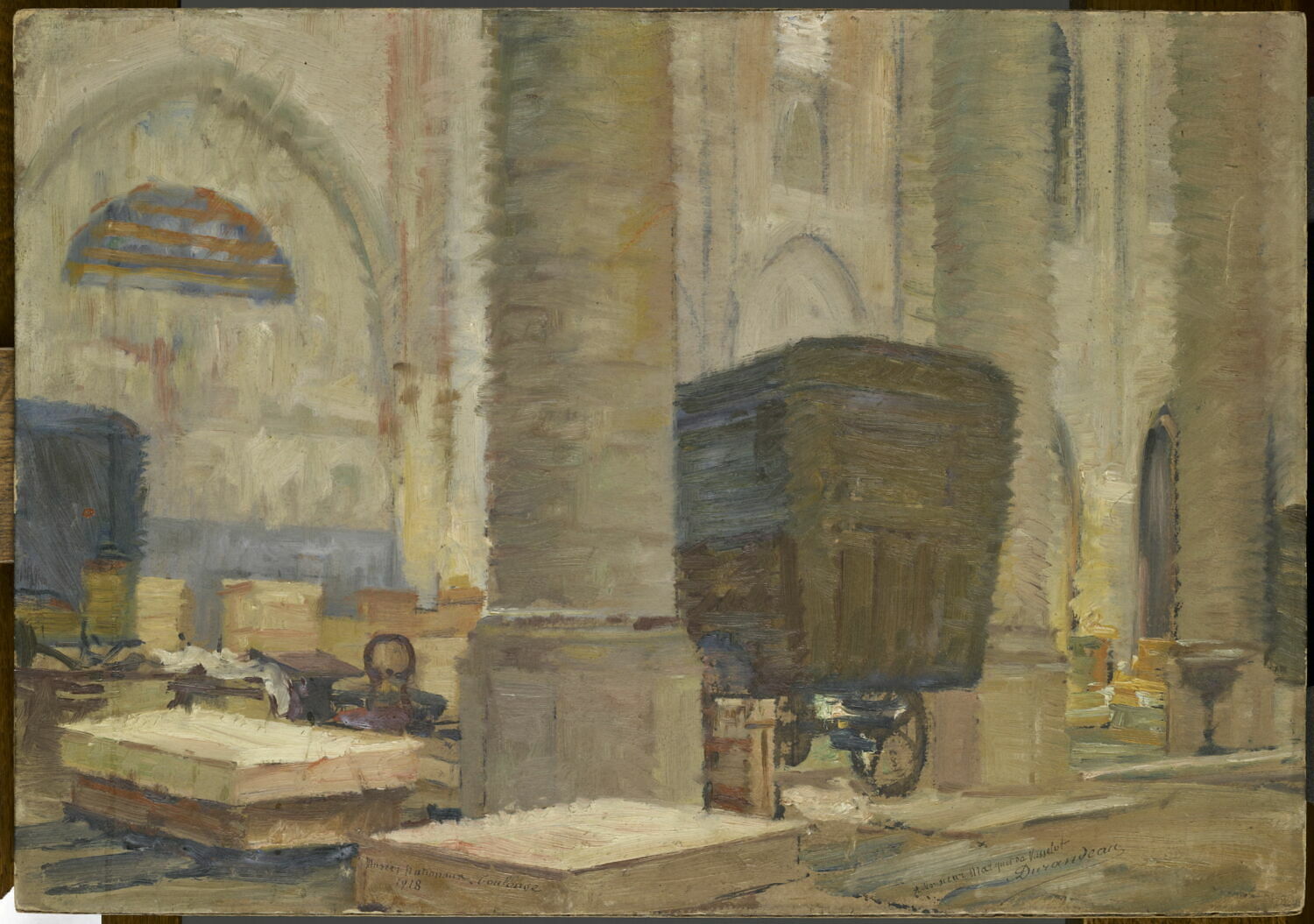 Intérieur de l'église des Jacobins de Toulouse en 1918, avec les voitures contenant les tableaux évacués du Louvre