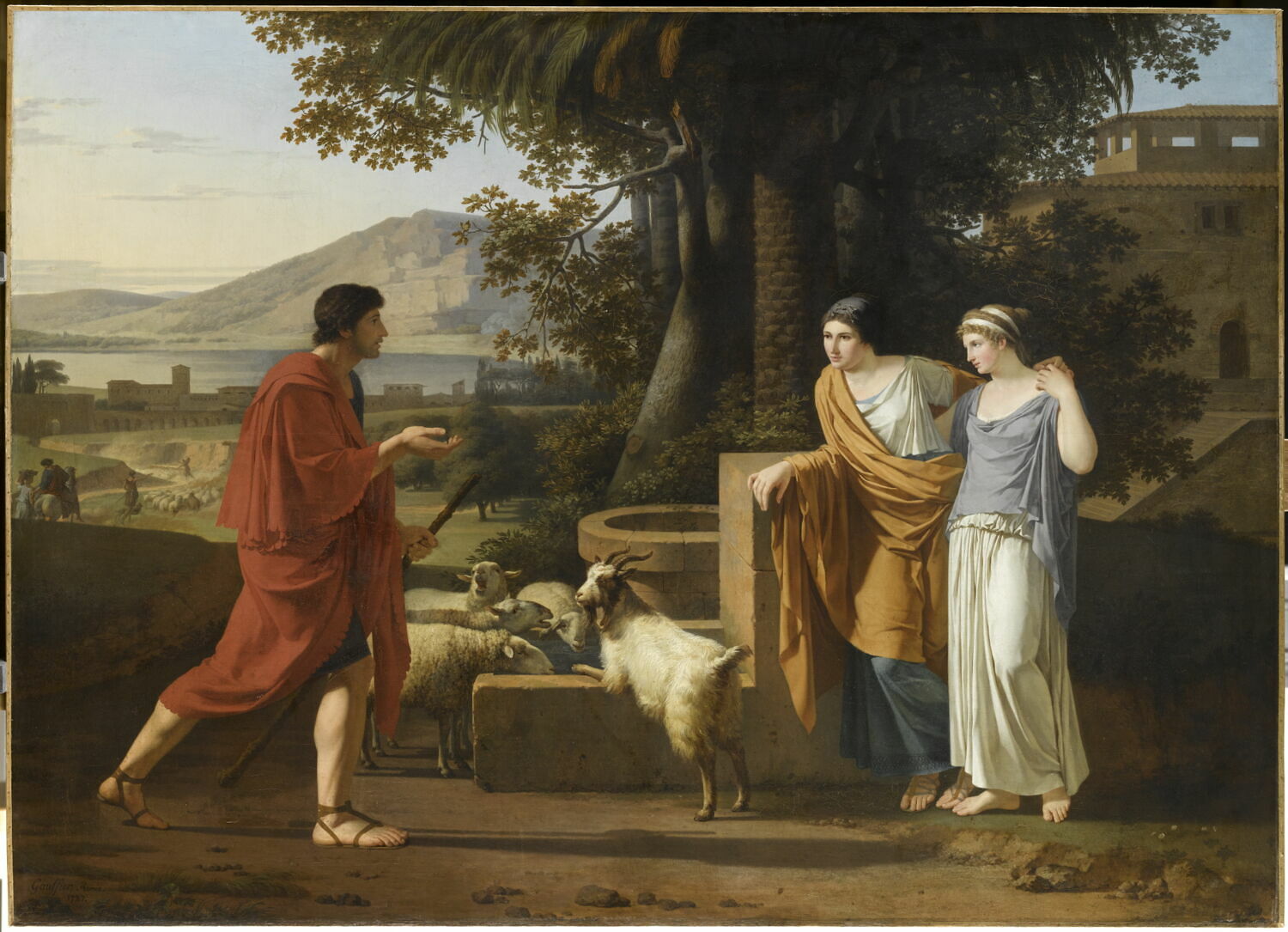 scène biblique (Jacob, rencontre, jeune fille, information, bienveillance, vêtement : à l'antique, mouton, chèvre, boisson animale, puits) ; paysage (lac, montagne, village, maison, palmier)