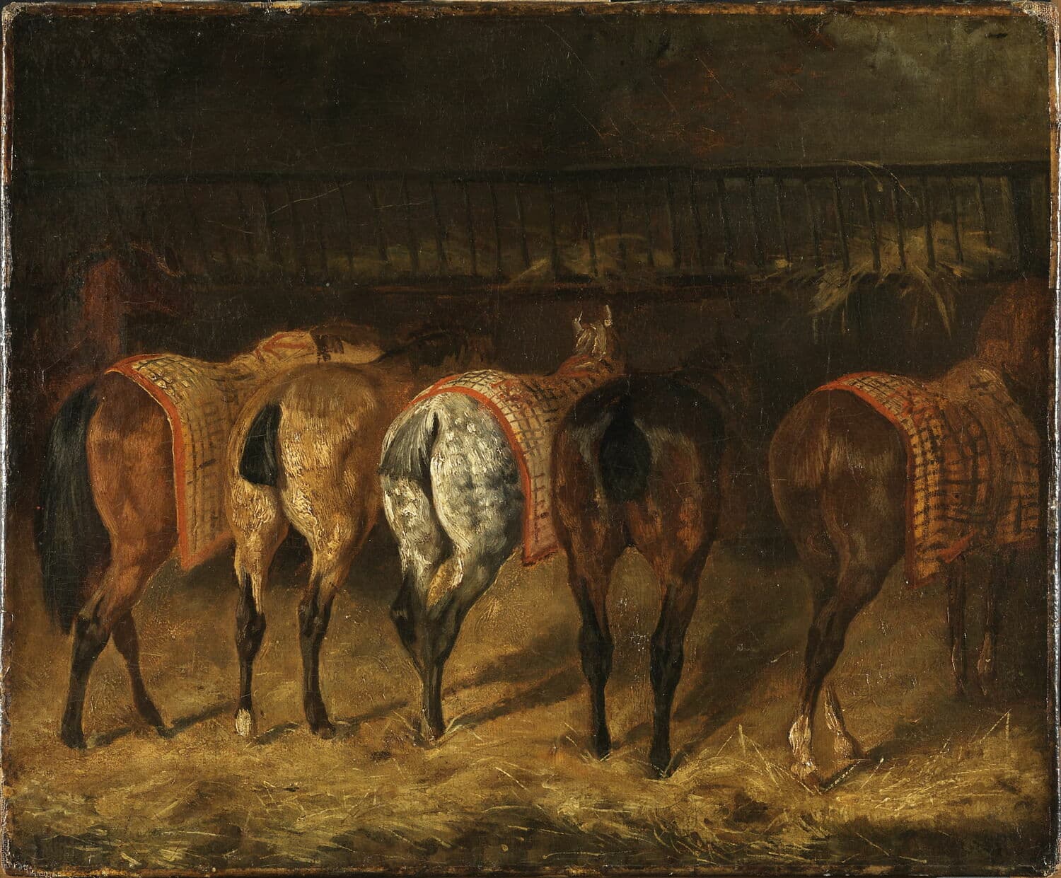 Cinq chevaux vus par la croupe dans une écurie