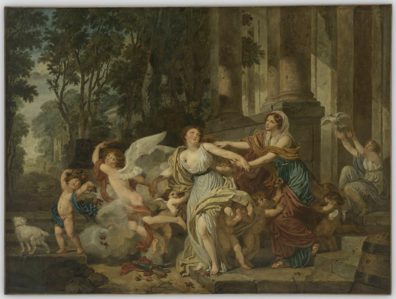 scène (jeune fille, départ, amour maternel, Eros, putti, enlèvement, colombe, chasteté) ; fond de paysage (arbre, élément d'architecture)