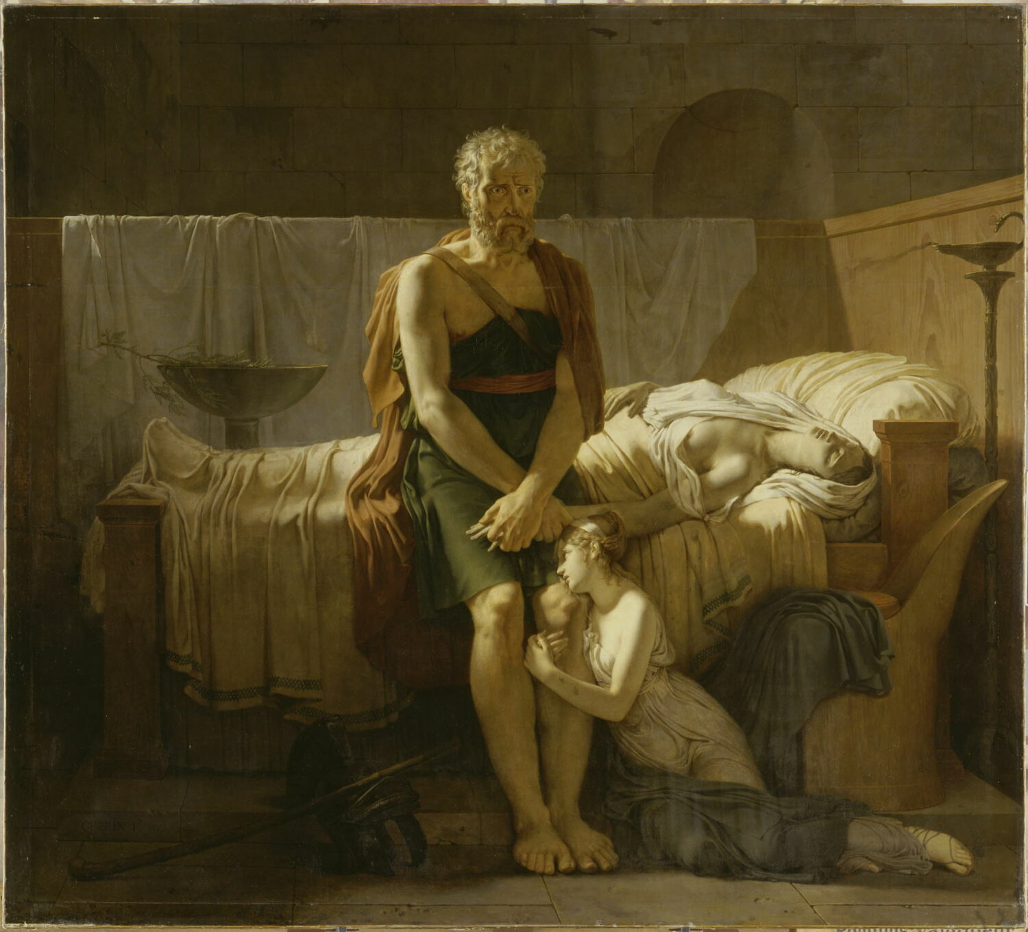 scène (Marcus Sextus, douleur, femme : cadavre, jeune fille, étreinte, mobilier : à l'antique, intérieur)