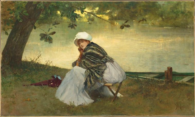 figure (femme, assis, de trois-quarts) ; fond de paysage (rivière, marronnier)