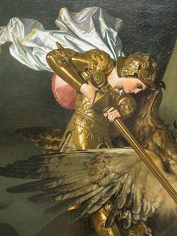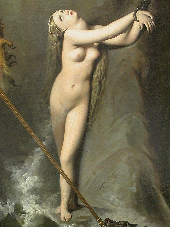 scène (Roger, délivrance, Angélique, captif, nu, lance, armure, hippogriffe, rocher, mer, croisade, dragon)