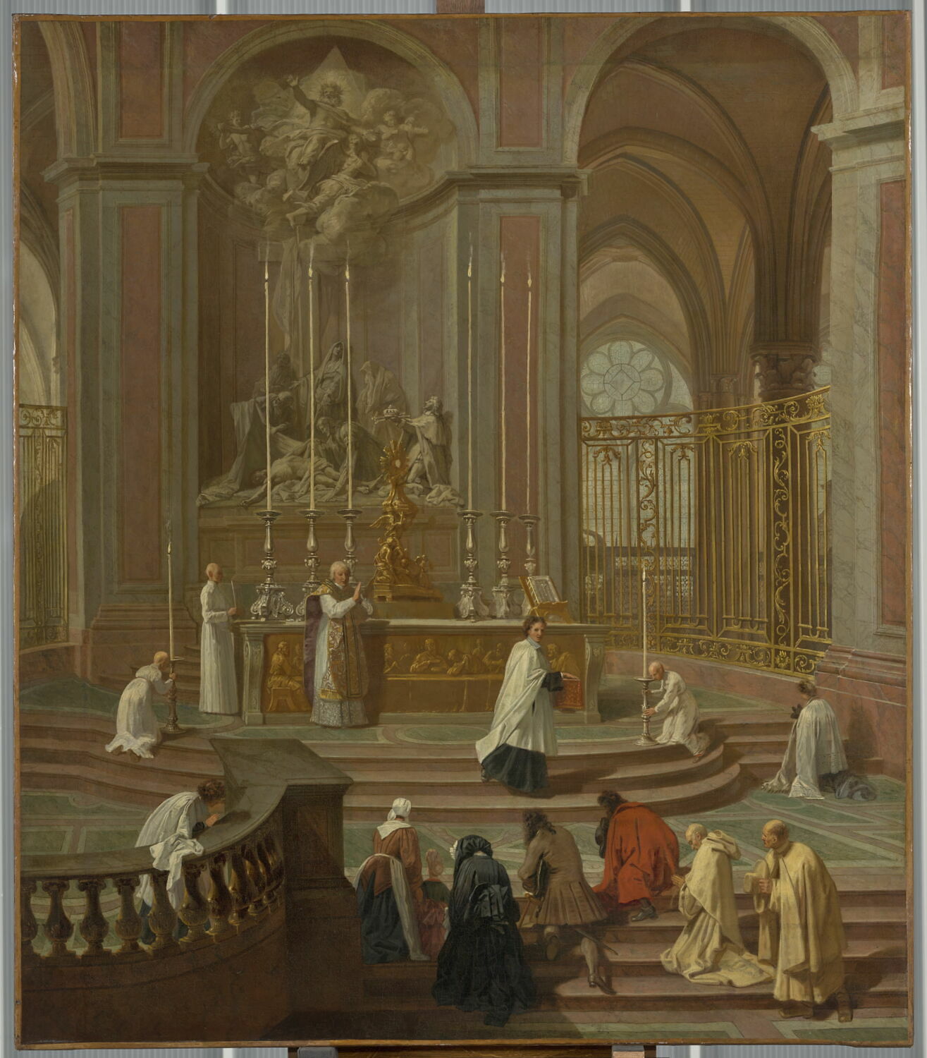 scène (La Porte chanoine de, messe, autel, objet du culte, Eucharistie, enfant de choeur, prière, chandelier, Paris, cathédrale : intérieur, sculpture, autel, vitrail)