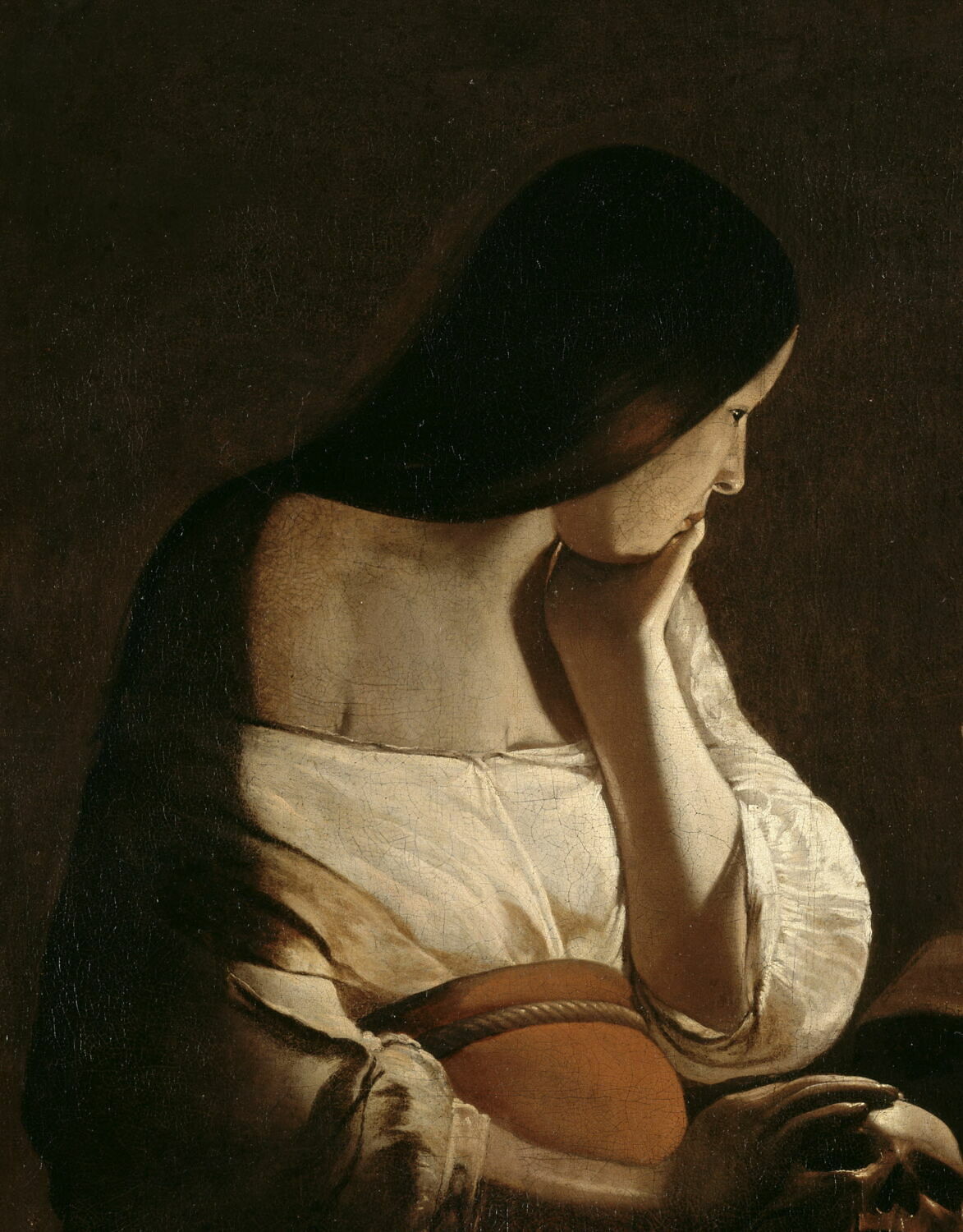 figure biblique (sainte Madeleine, femme, assis, de trois-quarts, crâne, réflexion, chandelle, livre)