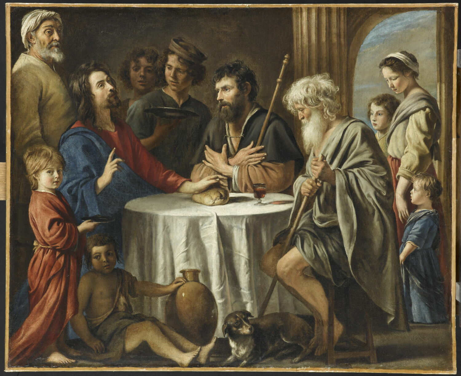 scène biblique (Pèlerins d'Emmaüs, repas, enfant, chien)