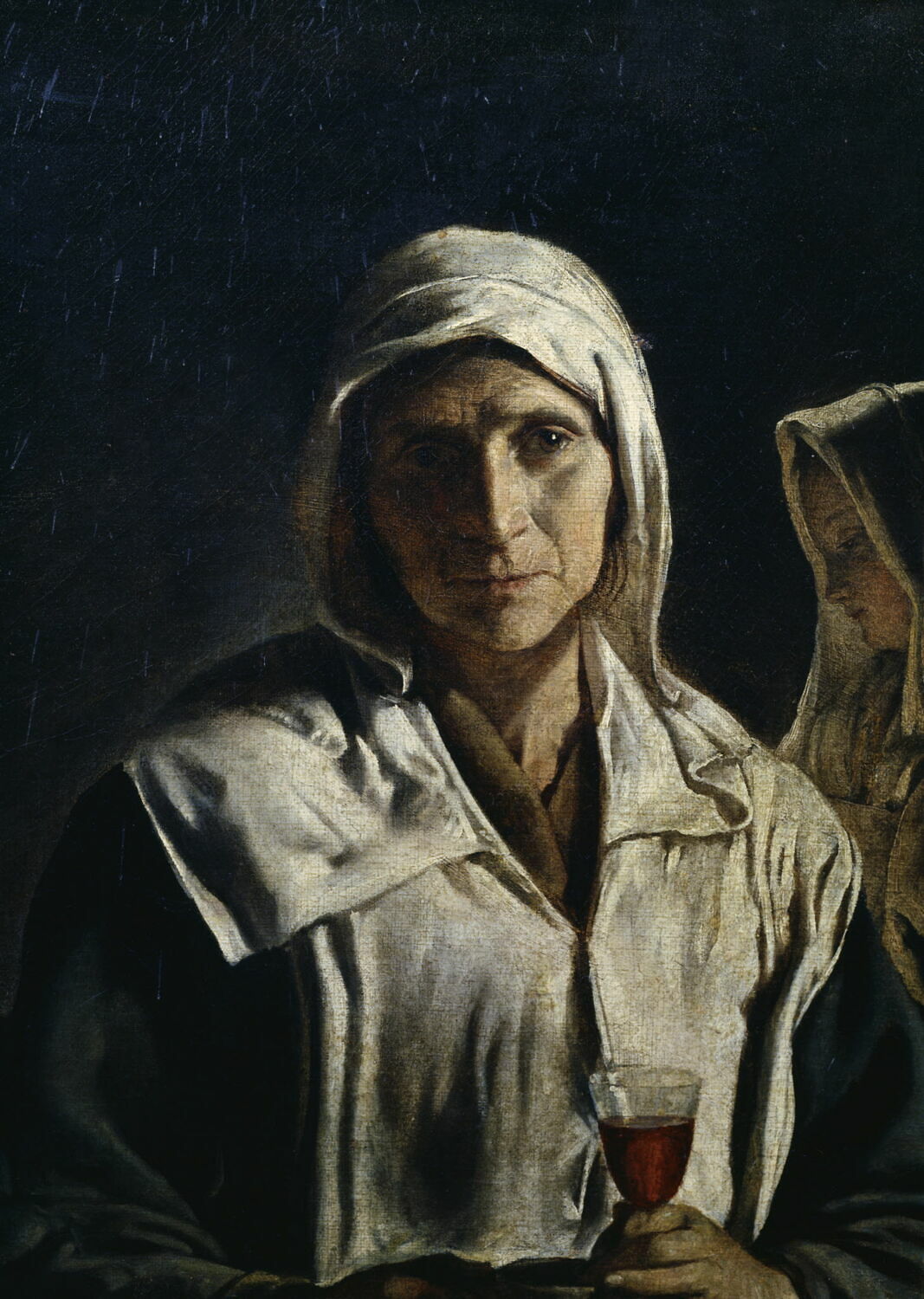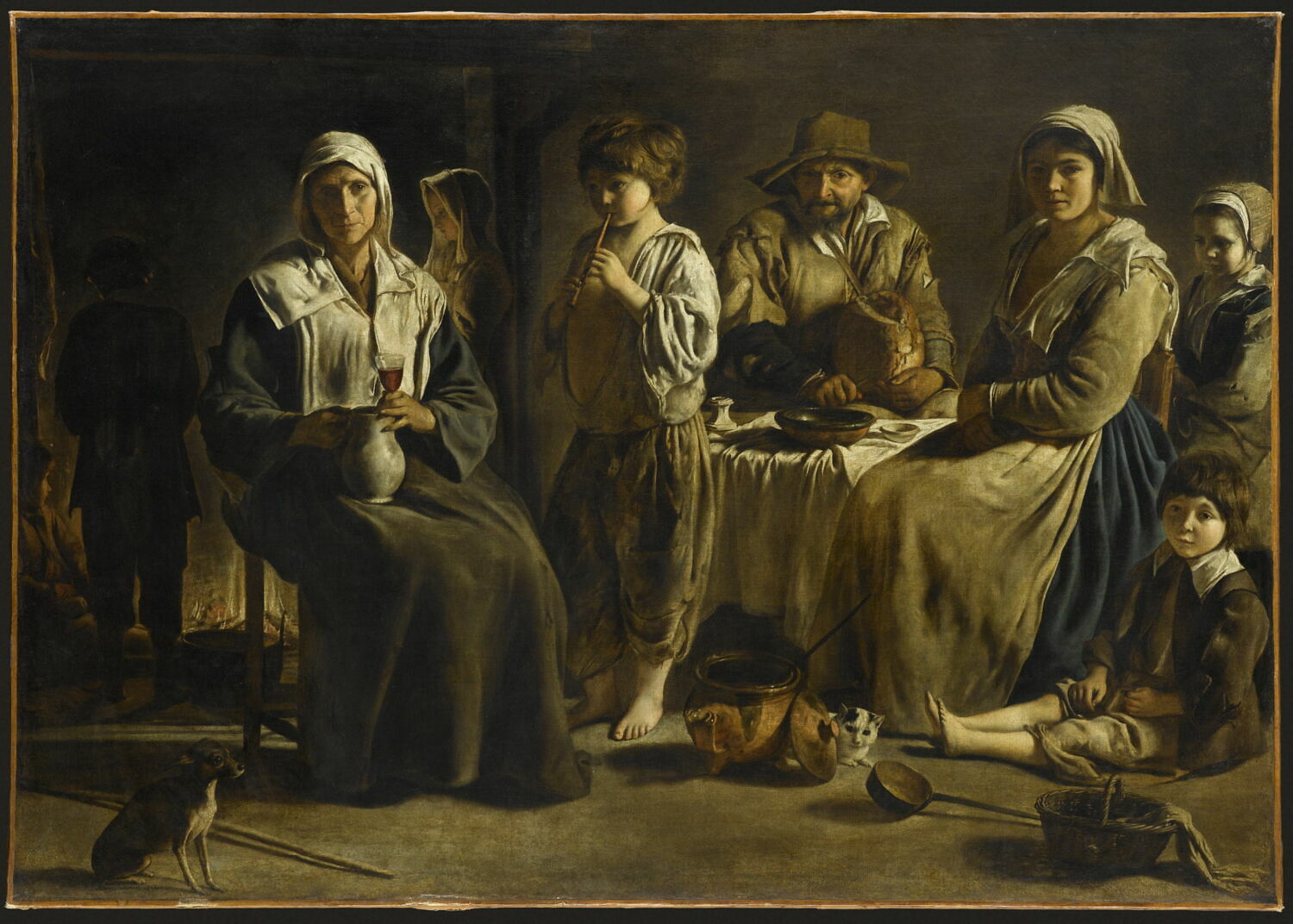 scène (famille, paysan, femme, garçon, flûte à bec, fillette, vieux, chien, chat, vaisselle, boisson, cheminée, panier, marmite, pot)