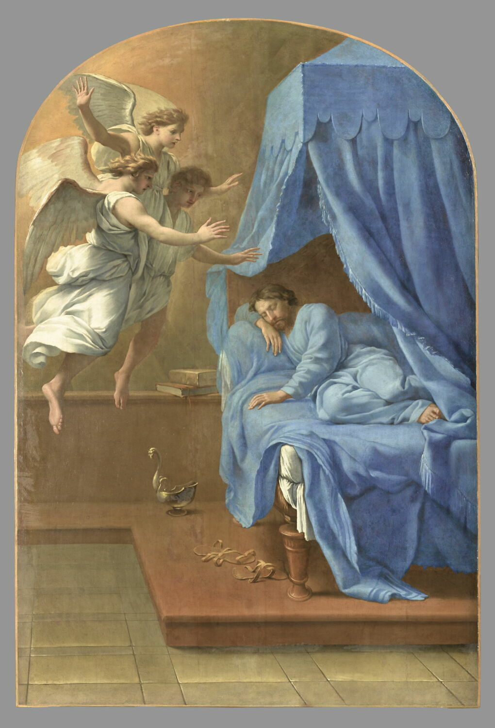scène (saint Bruno de Cologne, songe, ange, lit, dais) ; ange (en vol) ; chaussure