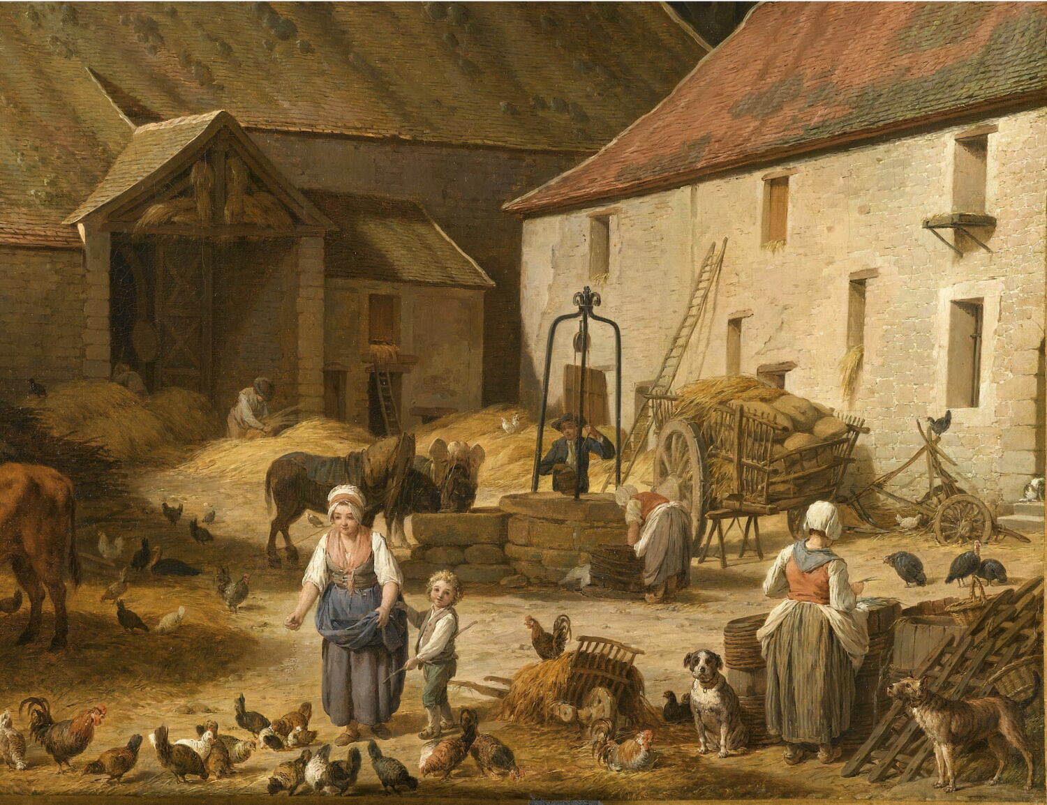 scène (ferme, cour de ferme, paysan, alimentation animale, basse-cour, charrette, boeuf, vache, puits, chien, enfant, brouette, outil agricole, grange, cheval, boisson animale, pigeonnier)