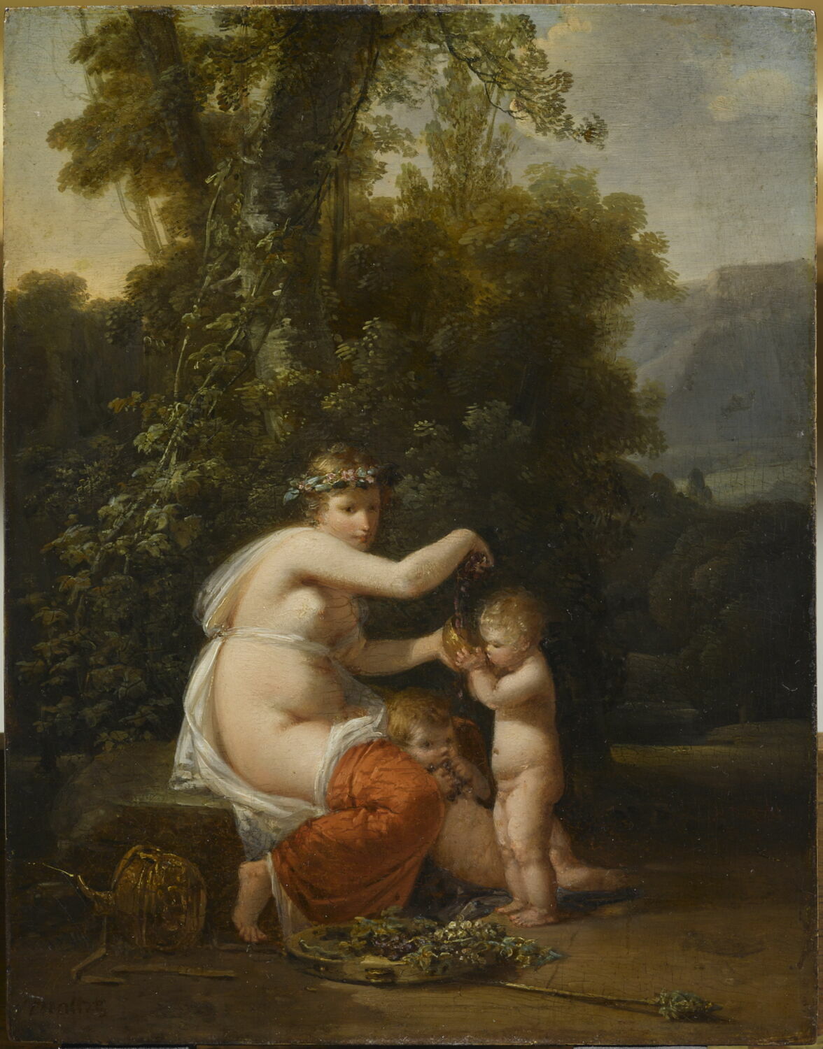 scène mythologique (Bacchante, enfant, boisson, nudité, fleur, raisin) ; fond de paysage (feuillu)