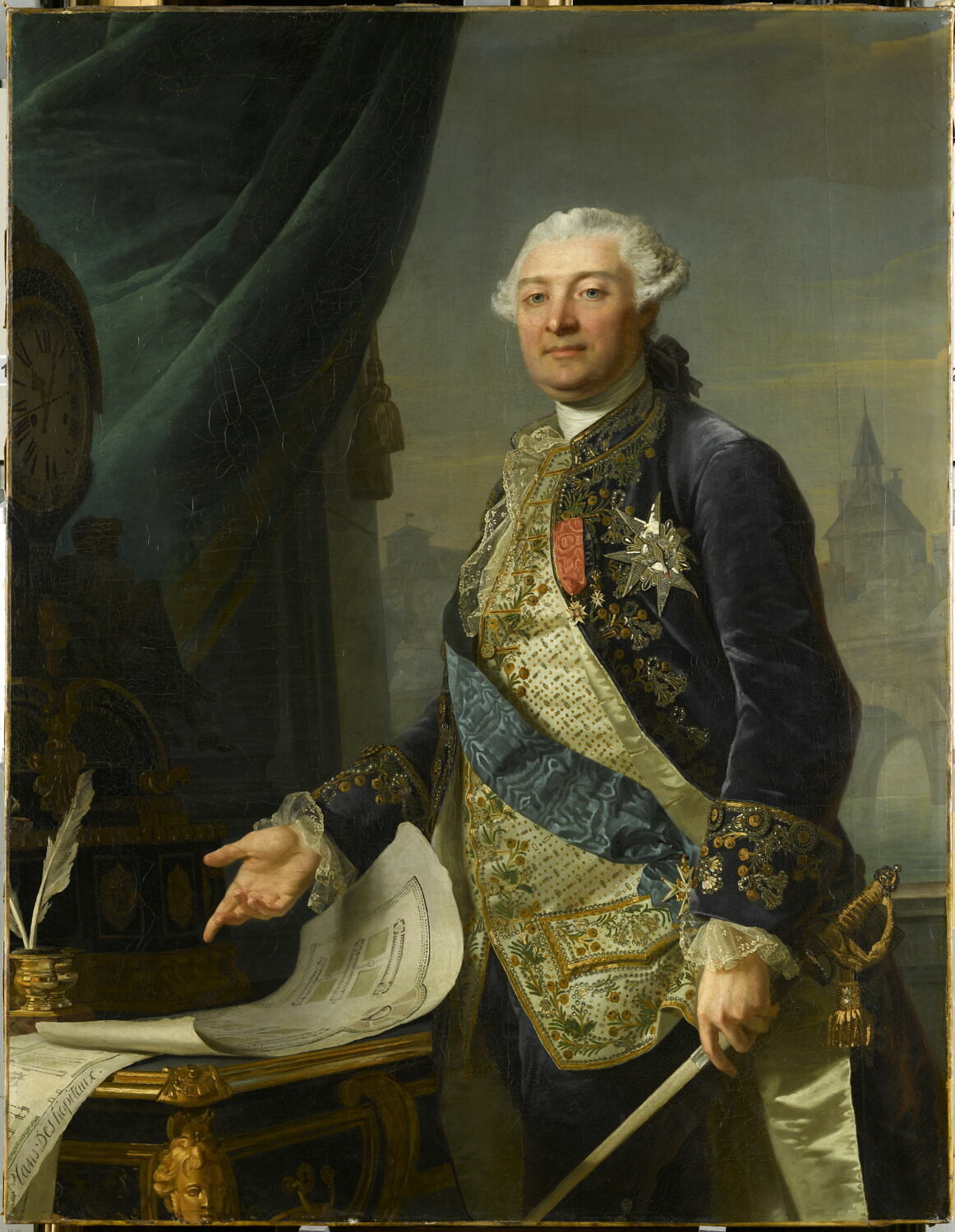 portrait (Le Tonnelier de Breteuil Louis Auguste, Breteuil Louis Auguste Le Tonnelier de, ministre, ambassadeur, homme, à mi-corps, de trois-quarts, Ordre du Saint-Esprit, plan, encrier, instrument d'écriture : plume) ; église ; pont