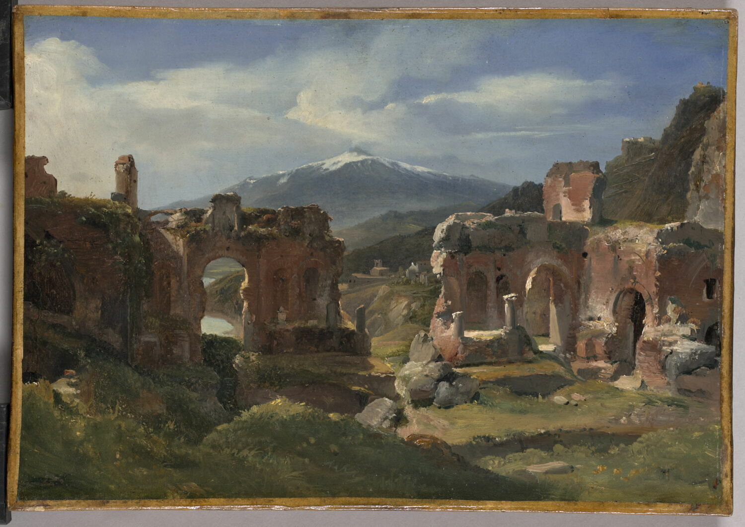 vue d'architecture (ruines, théâtre, à l'antique, Taormina) ; montagne