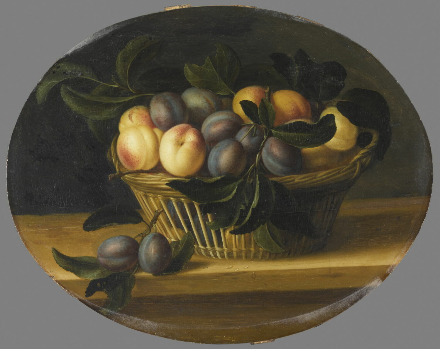 nature morte (pêche fruit, prune, panier : vannerie)